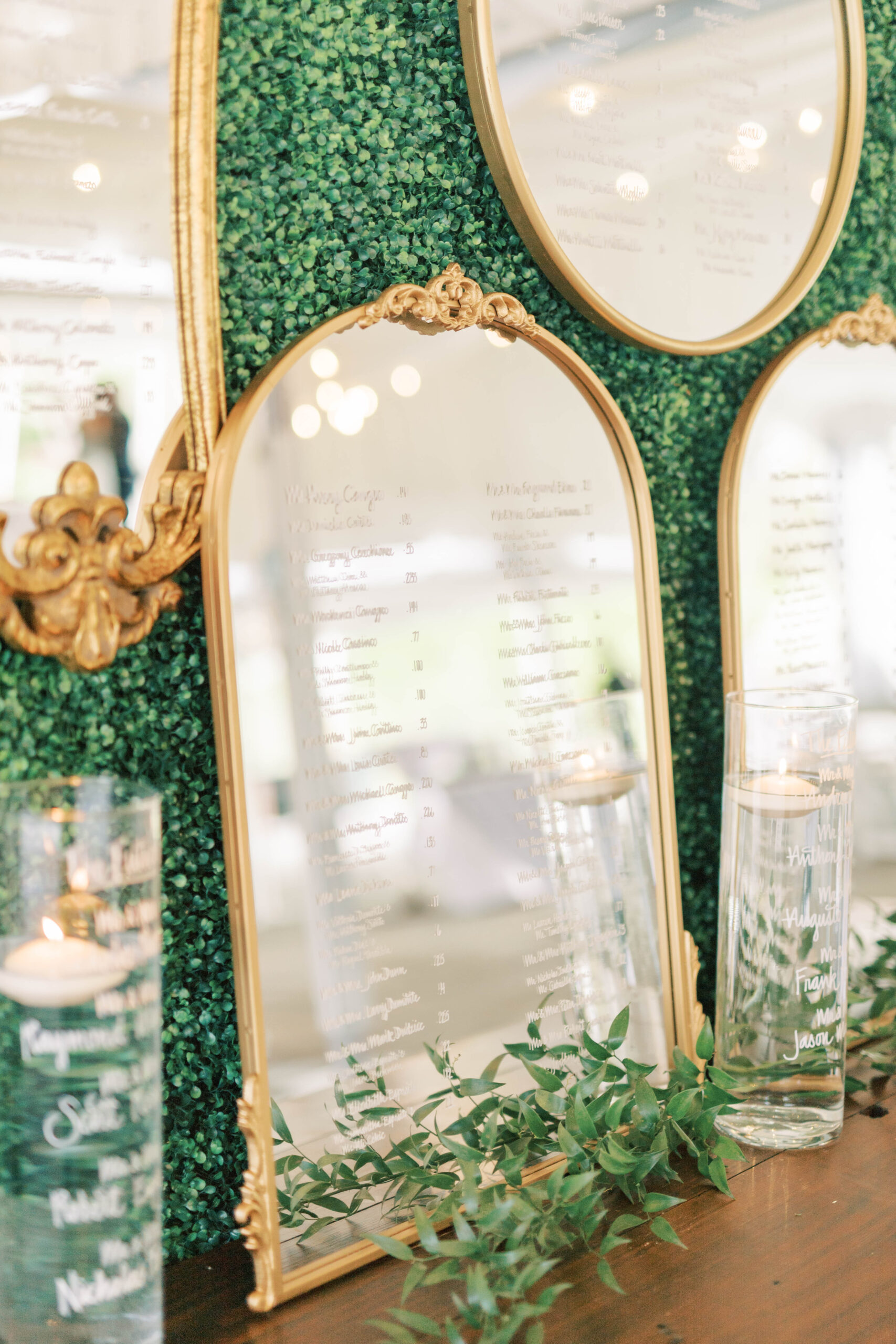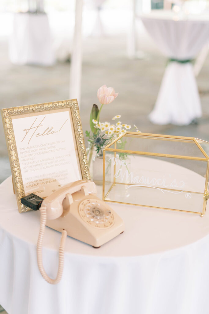 Guests recorded voice messages for the newlyweds on a rotary phone. They also found their seating assignment written on mirrors.