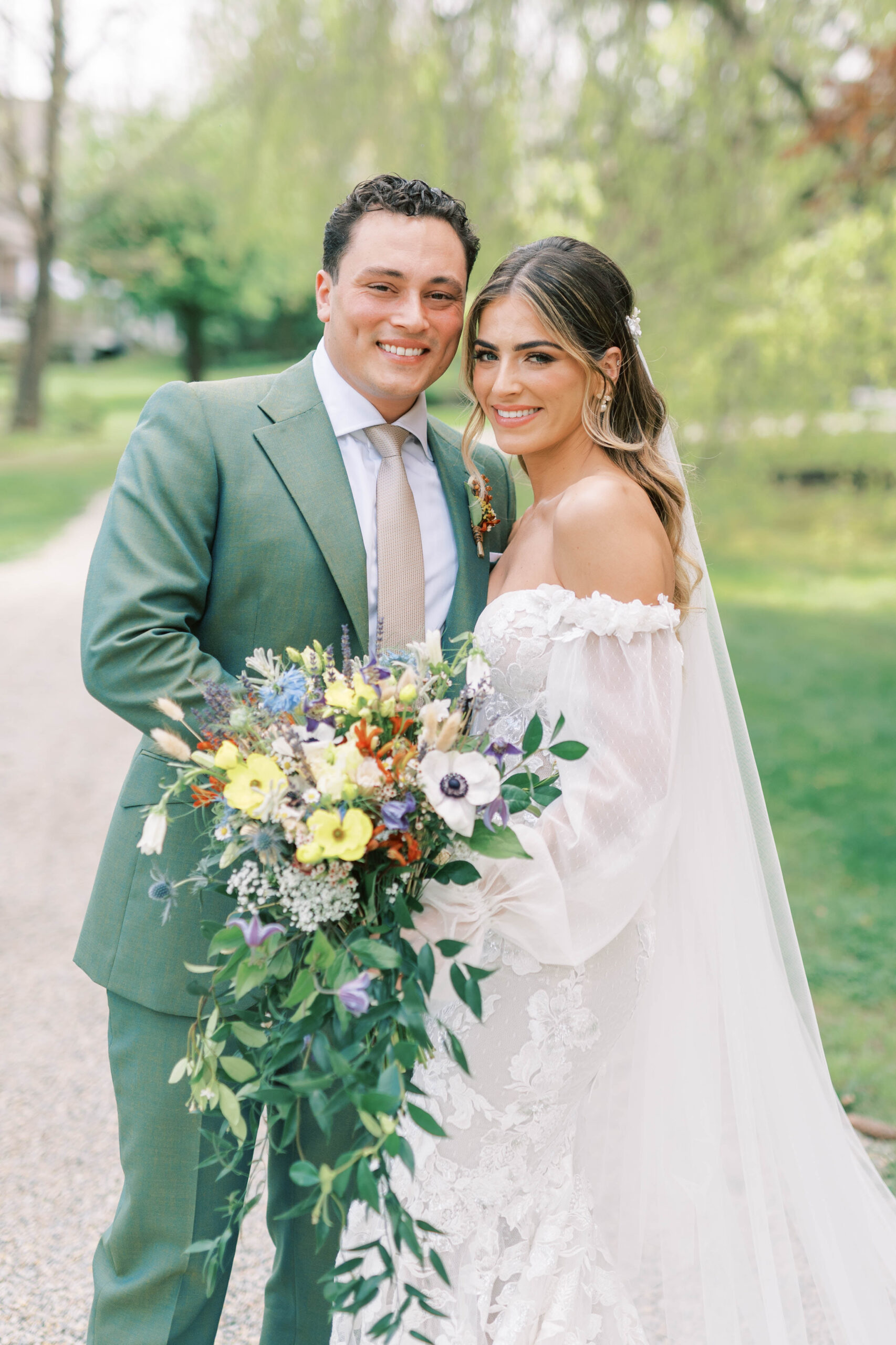 The couple, both 27 at their May 13, 2022, wedding, had an elegant event with an outdoor ceremony and reception in the modern farmhouse at Crossed Keys Estate in Andover. Nicolette loved the venue’s open space, gorgeous wood floors and beams, and a soaring window. “I love greenery,” she says. “I love wildflowers. I wanted it to feel like you were in an enchanted garden.” The space was filled with candlelight and a white and green palette. Nicolette, a vocalist, sang a slow and romantic acoustic version of Tina Turner’s “The Best” to Rob as they shared their first dance. “It was a special moment,” she says.
