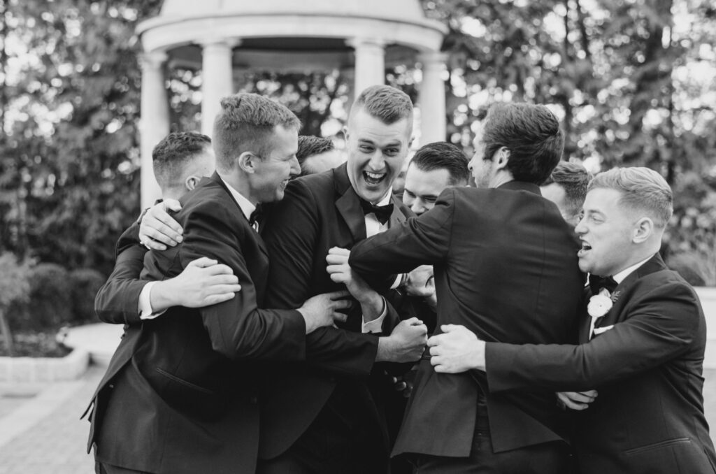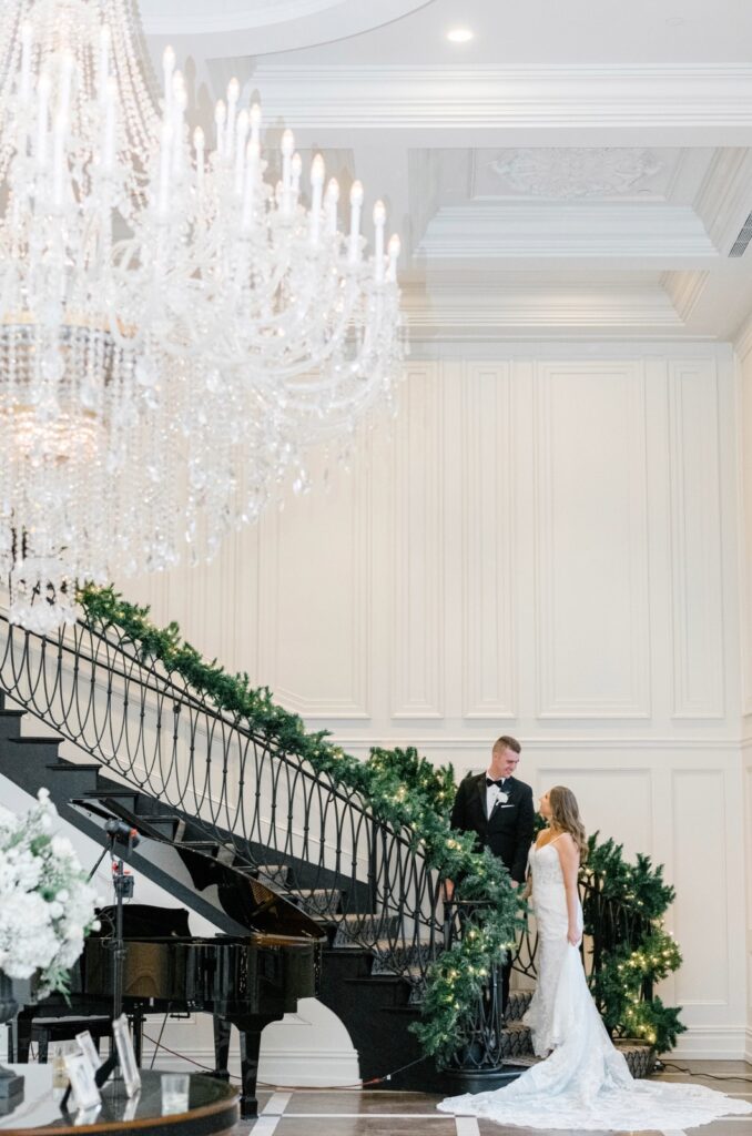 “We had a dreamy winter wedding on December 9, 2022,” says Nikki. “The girls wore a deep emerald green and the guys were in classic black tuxedos. We had whites florals and winter greens, with romantic candles lined down the ceremony aisle and then on the reception tables. It was romantic and classy just as I had envisioned it would be! I owe that to Florentine Gardens and our amazing florist Laurie and her team at Laurel Wood Designs.”