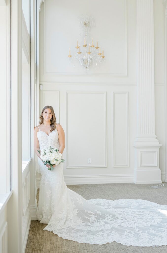“As some say it goes, my gown was one I would not have chosen entirely on my own,” says Nikki. “I owe that to the expertise of the Aleanna’s Bridal in Paramus. They listened to what I liked and did not like about the gowns I was trying on and then brought me “the one” It is a Demetrios fit and flare gown with beading and lace work and a gorgeous train. They altered it in-house and added my bustle. I paired it with a simple short italian tulle veil. It was perfect!”