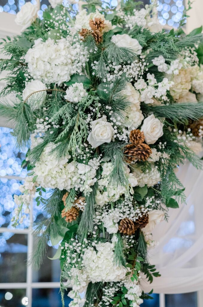 With white and green florals and pine cone accents, “it was romantic and classy, just as I had envisioned it would be,” says Nikki. “The floor-to-ceiling windows in the ballroom were the cherry on top of it all. Stunning views of the twinkle lights in the garden made our romantic vibes only that much stronger.”
