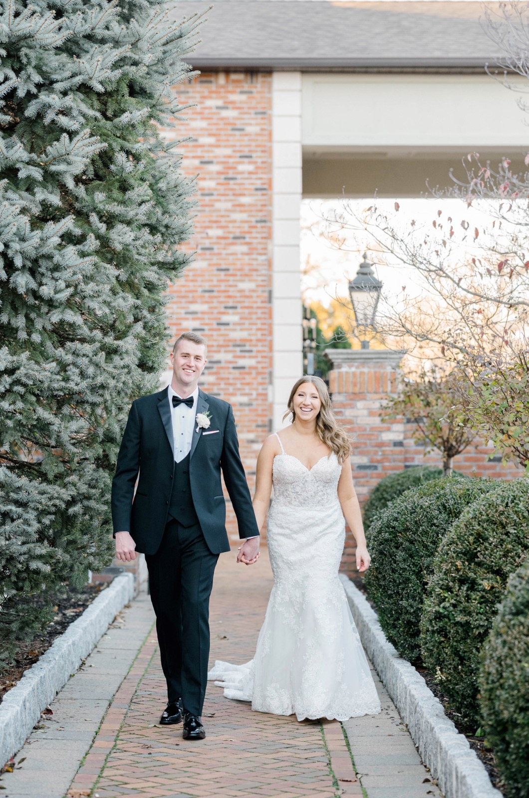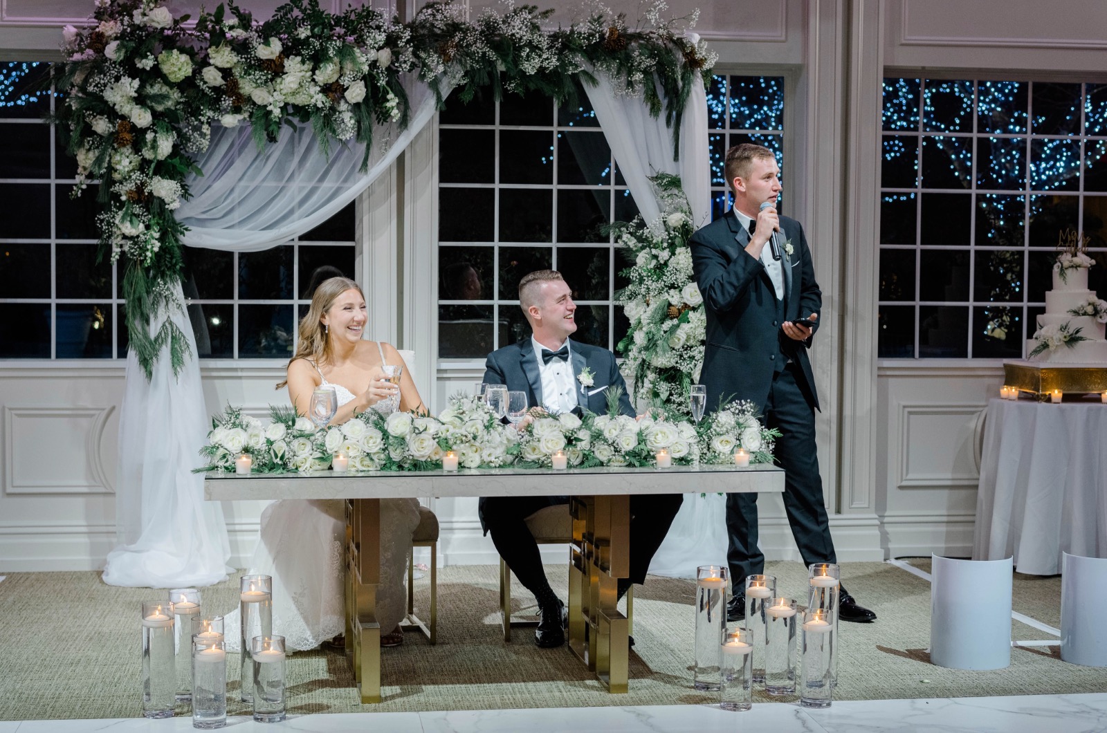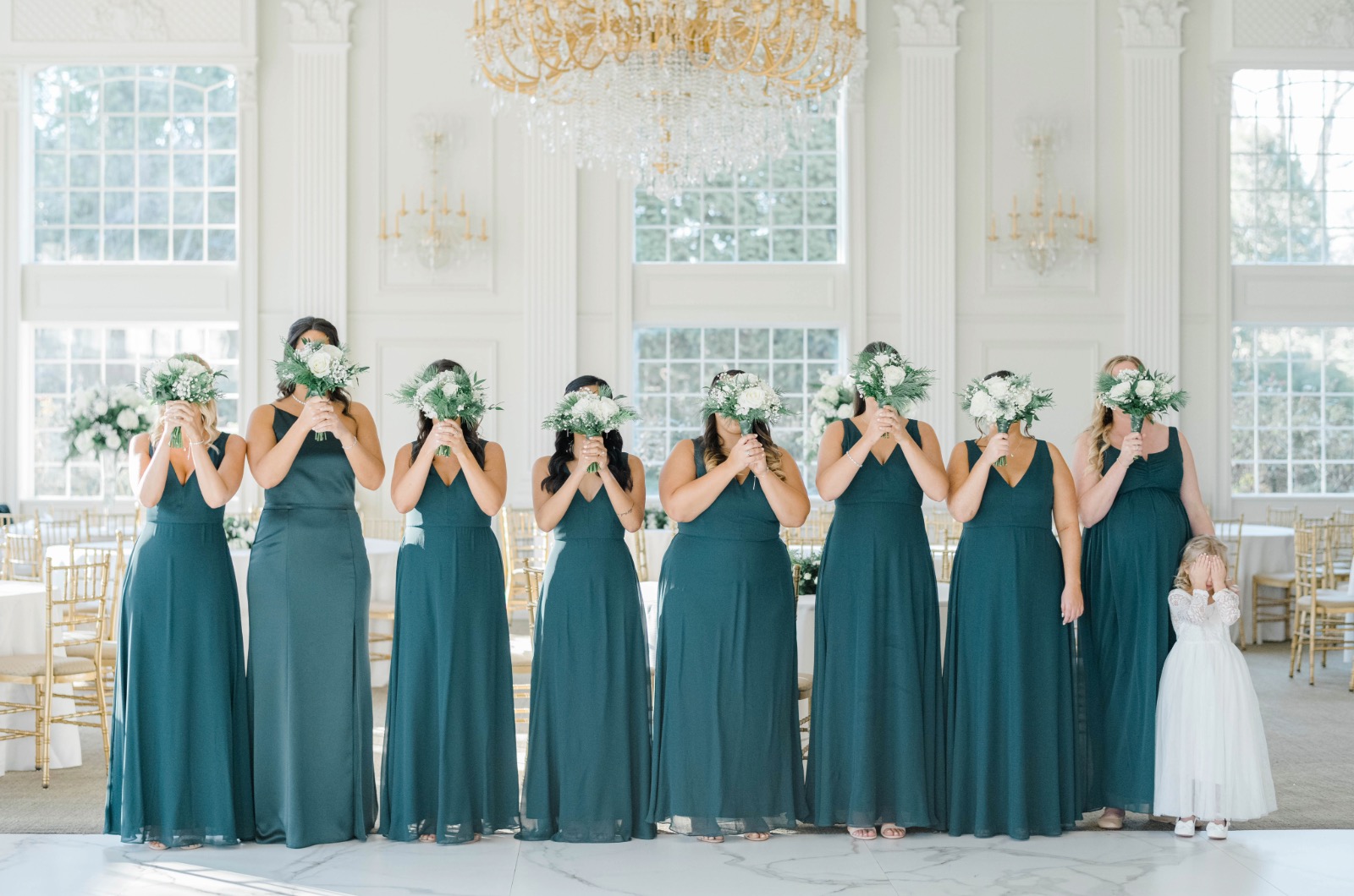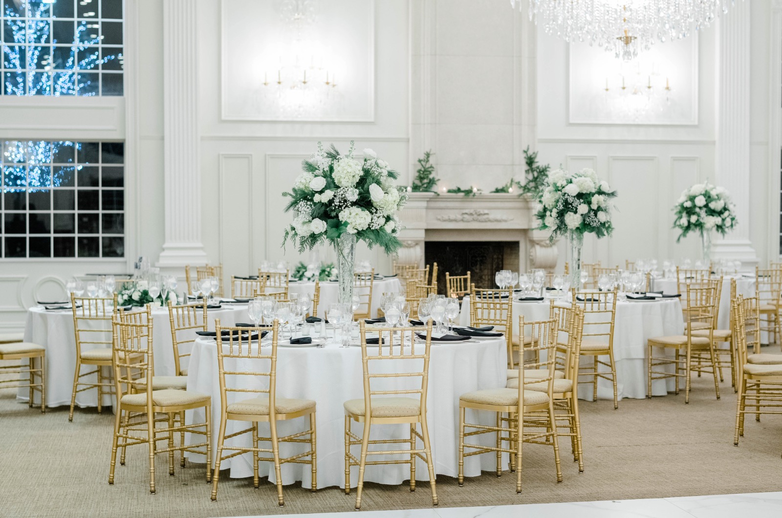 “We had a dreamy winter wedding on December 9, 2022,” says Nikki. “The girls wore a deep emerald green and the guys were in classic black tuxedos. We had whites florals and winter greens, with romantic candles lined down the ceremony aisle and then on the reception tables. It was romantic and classy just as I had envisioned it would be! I owe that to Florentine Gardens and our amazing florist Laurie and her team at Laurel Wood Designs.”