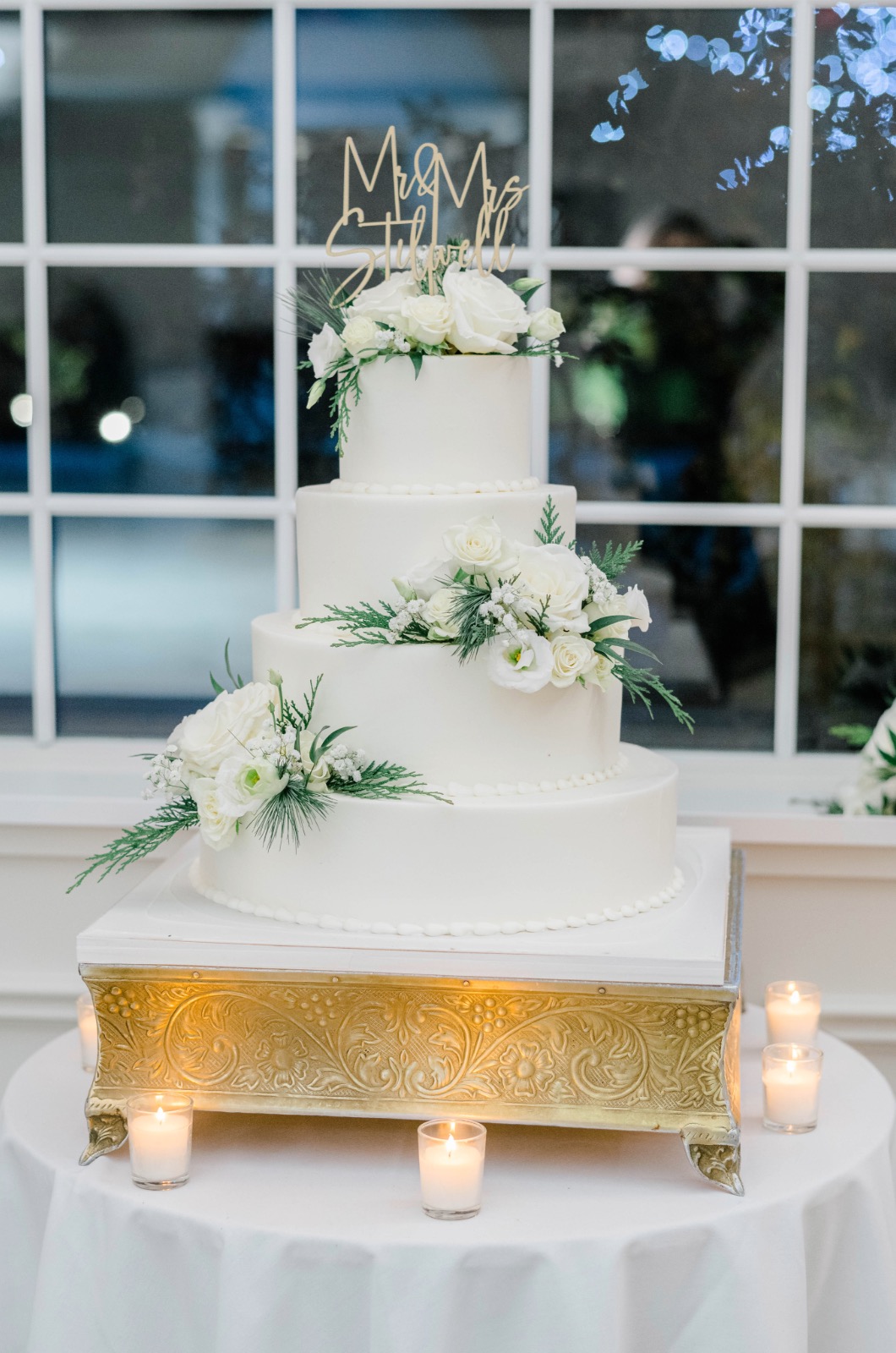 With white and green florals and pine cone accents, “it was romantic and classy, just as I had envisioned it would be,” says Nikki. “The floor-to-ceiling windows in the ballroom were the cherry on top of it all. Stunning views of the twinkle lights in the garden made our romantic vibes only that much stronger.”
