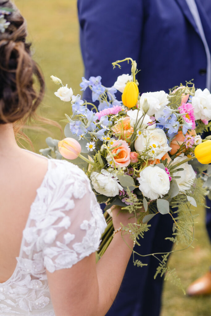 They chose a palette of neutral tones, but added pops of color through florals with a combination of poppy pink, daffodil yellow and tangerine orange.