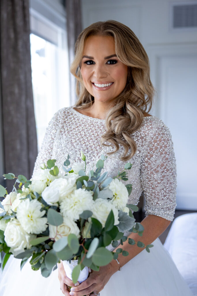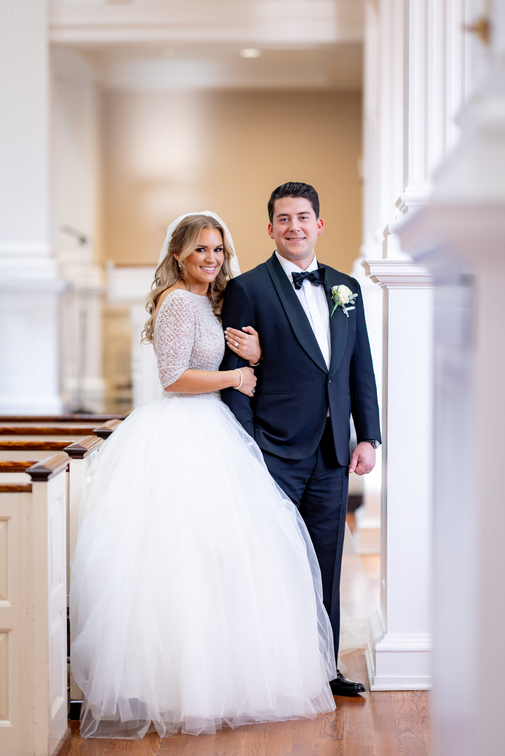 Robin’s Sottero and Midgley Allen dress came from Seng Couture. The top was a boatneck style with three-quarter-length sleeves and an open back that was completely covered with Swarovski crystals and pearls. The bottom was a full ballgown with beautiful layers of tulle. She paired it with a cathedral-length veil that also had intricate beading at the bottom.