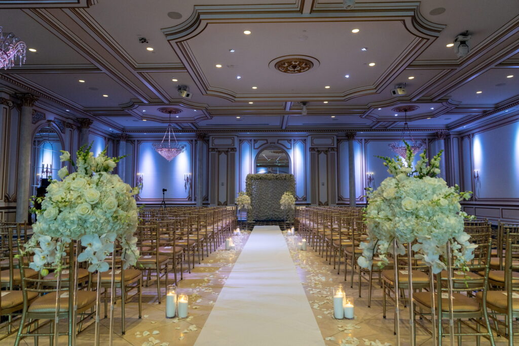 The aisle at their indoor ceremony was lined with white petals. They had large glass vase centerpieces filled with white orchids, hydrangeas, Tibet roses and gladiolus. Their flower wall was decorated with fresh white hydrangeas and Tibet roses.