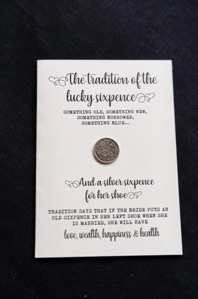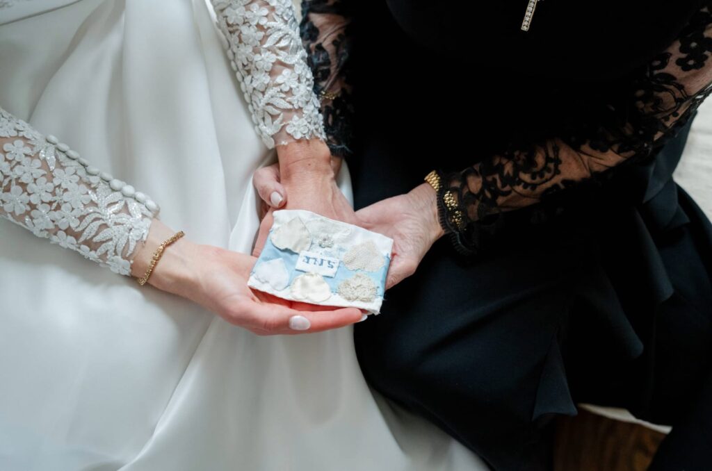 Sarah carried a keepsake made by her grandmother in her pocket the whole night, featuring swatches of wedding gowns worn by the women in their family and the name of a poem read at the wedding of Justin’s grandmother.