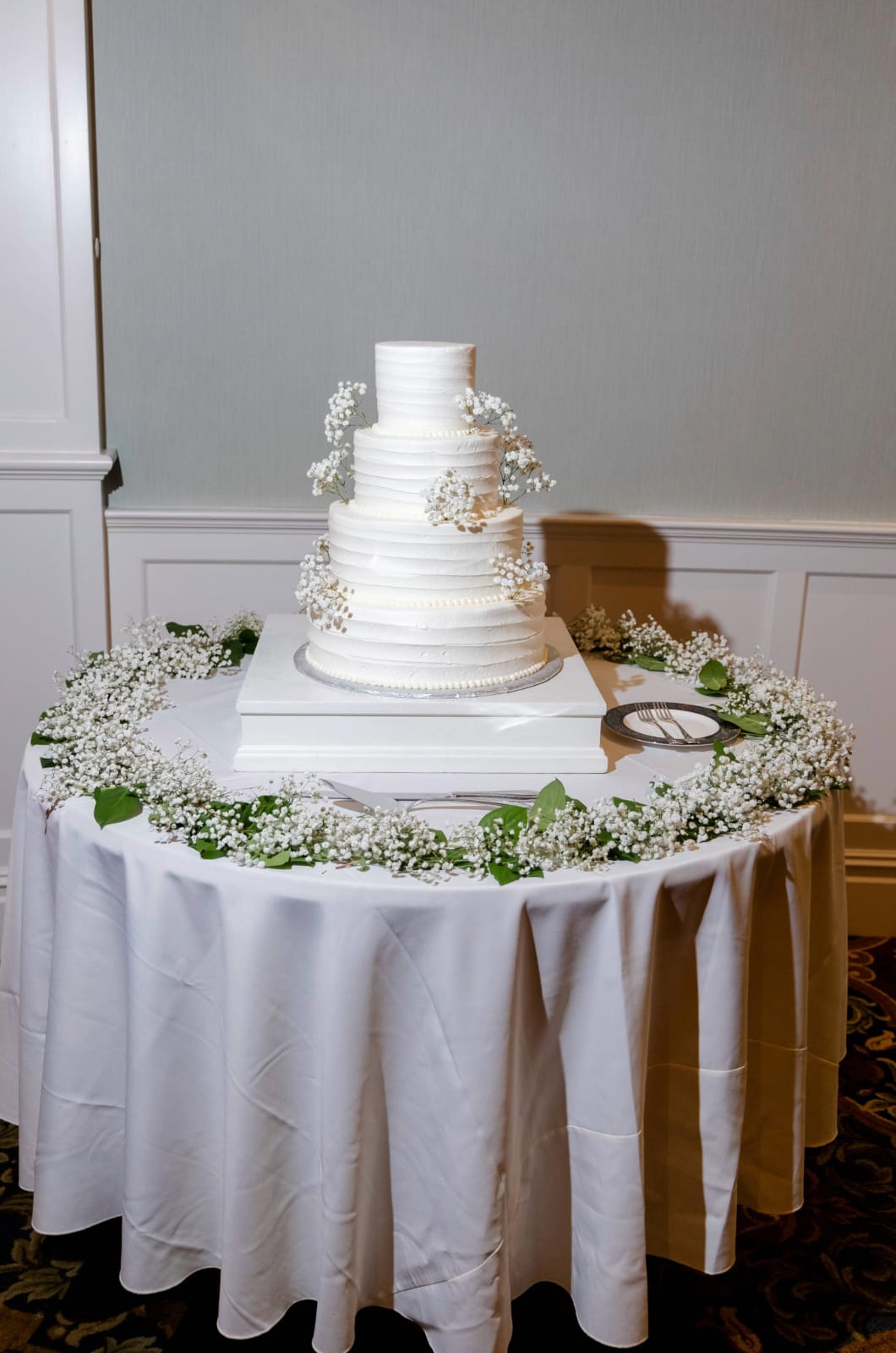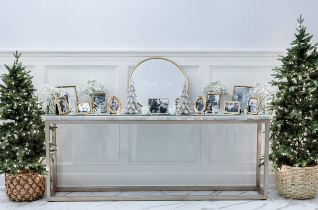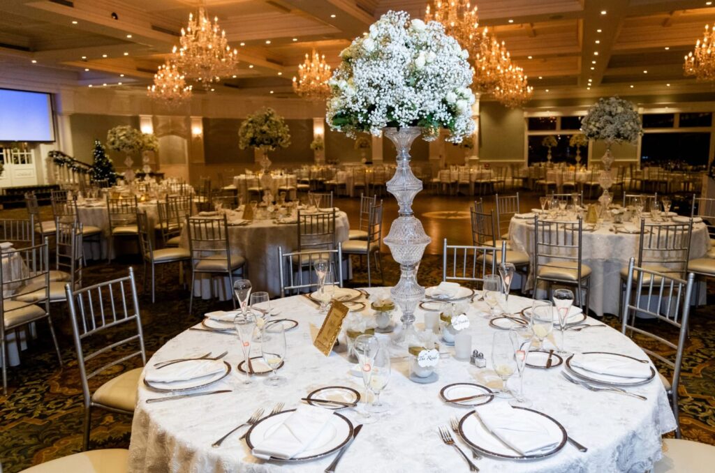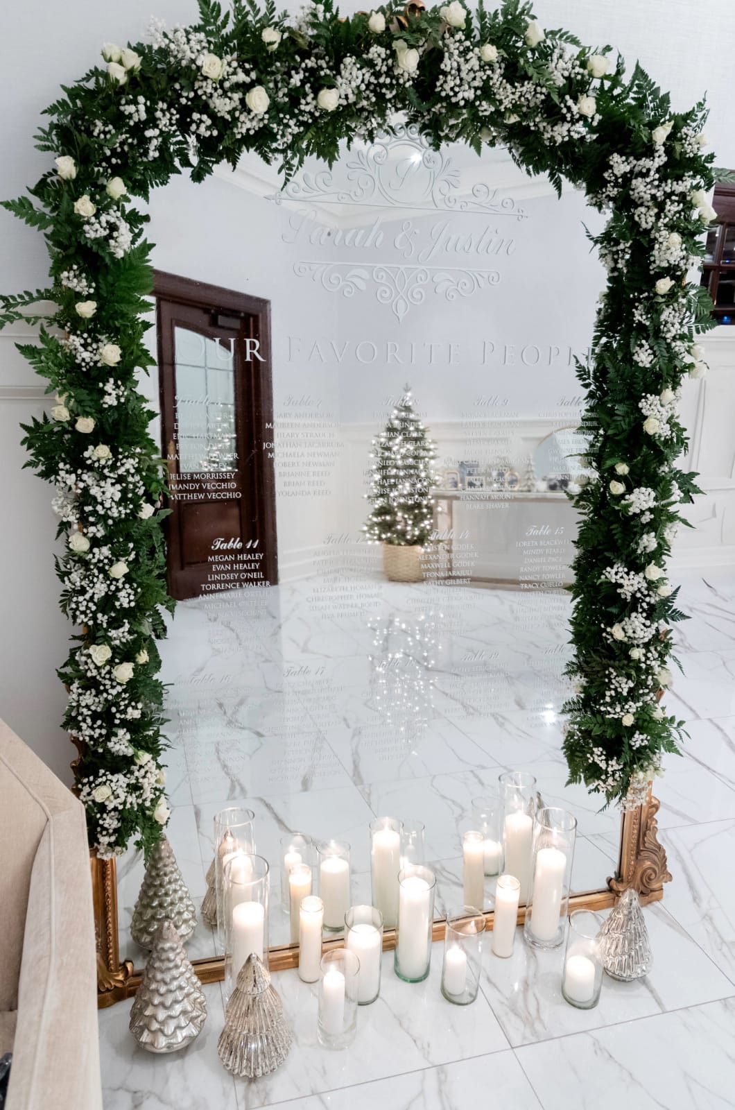 The bride’s vision of a warm and inviting yet showstopping winter event featured baby’s breath, white spray roses and greenery, with touches of gold.