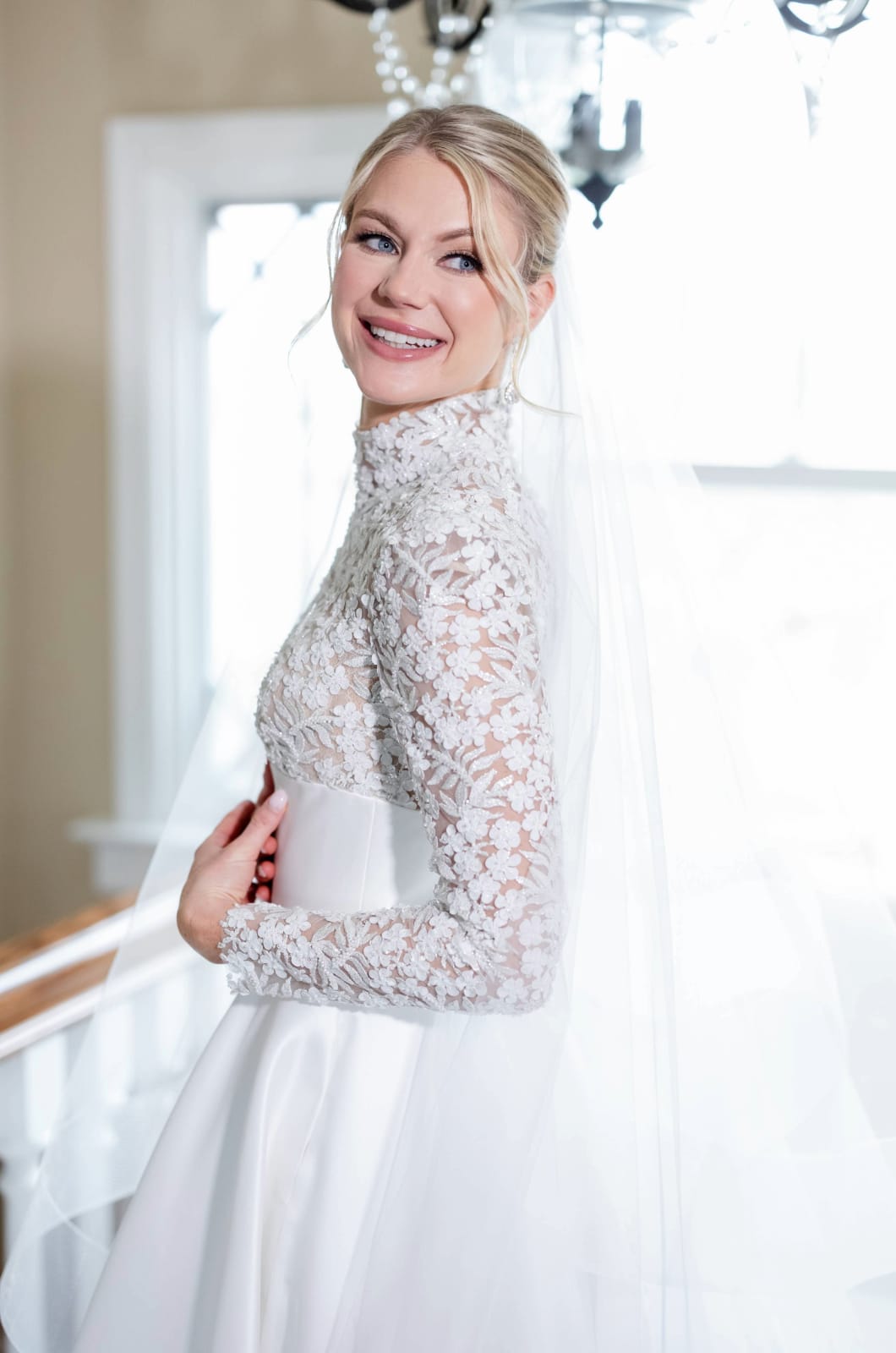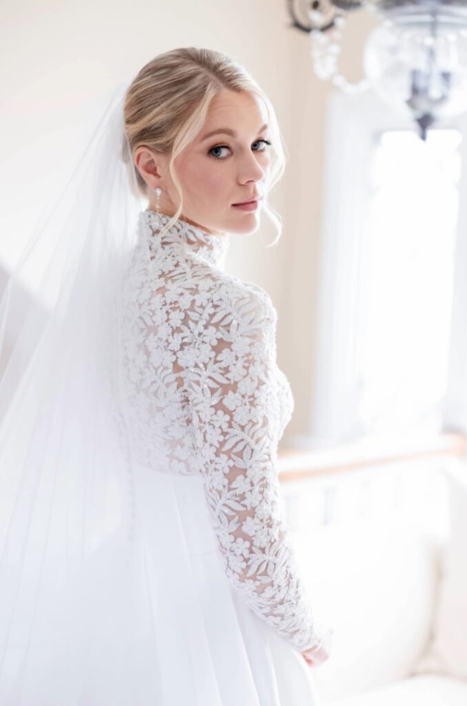 Sarah wore a stunning Rivini by Rita Vinieris ballgown with a long-sleeved floral lace top with a high neck (which reminded her of snowflakes). It was the first dress she tried on. “I always wanted to look like a princess,” the bride says. She later changed into a gold party dress by Love by Pnina Tornai, perfect for dancing.