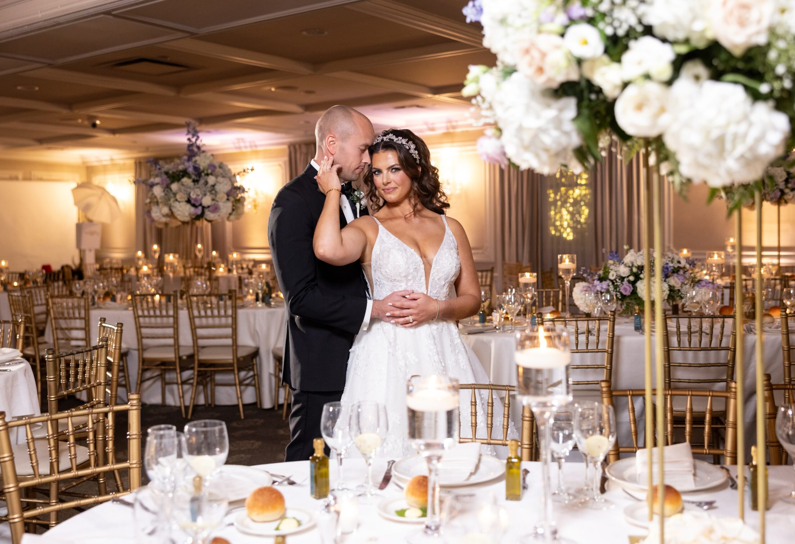 For their fall wedding at Park Savoy, the couple chose mainly white flowers, “with pops of lavender and deep blue.”