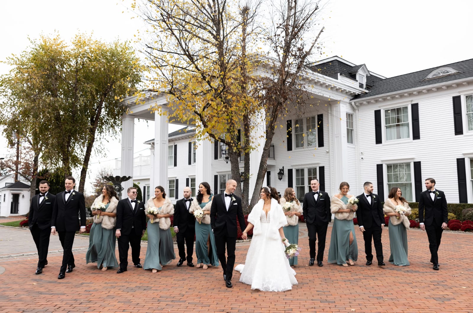 The bridesmaids donned “sea glass green” gowns and also wore fur shawls for photos.