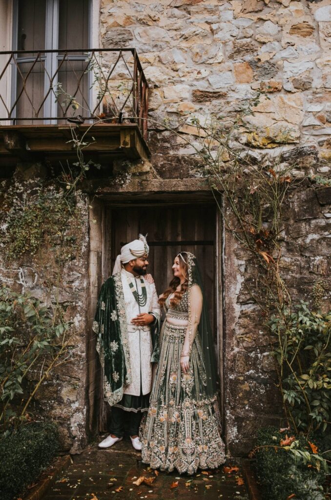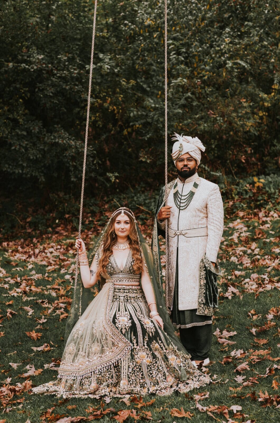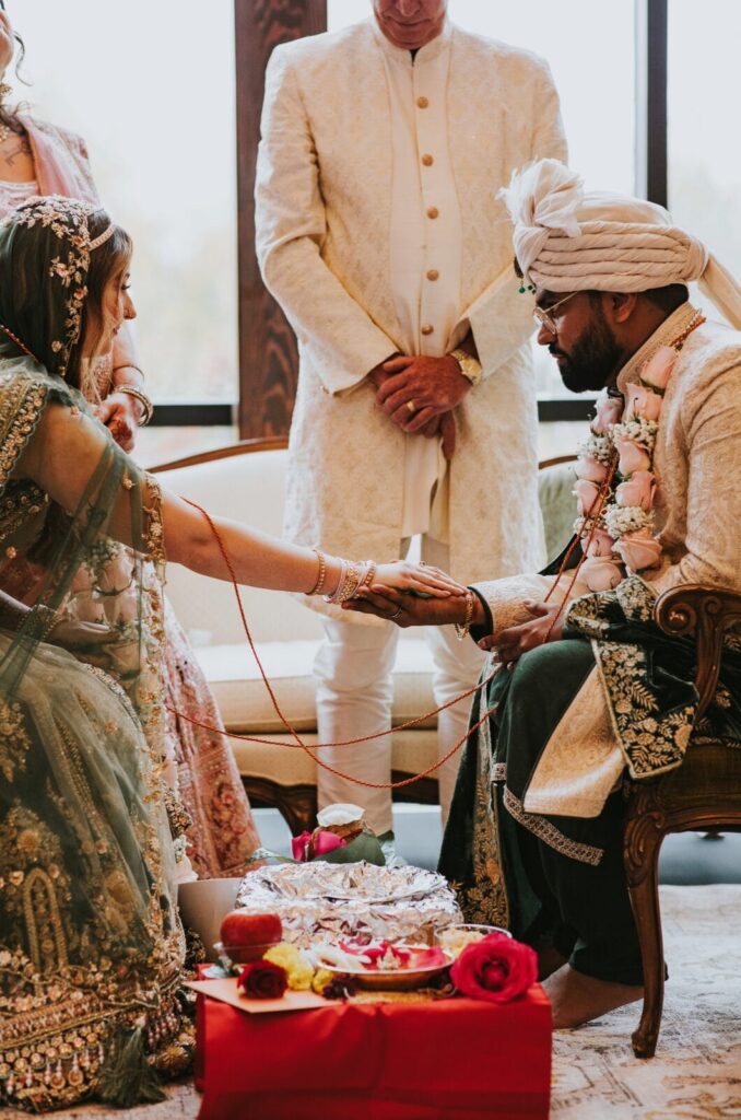 The couple and the wedding party wore traditional Indian wedding clothing—with Shannon’s heavily beaded and embroidered olive green velvet bridal lehenga as the centerpiece—as the couple were blessed by a Hindu priest.
