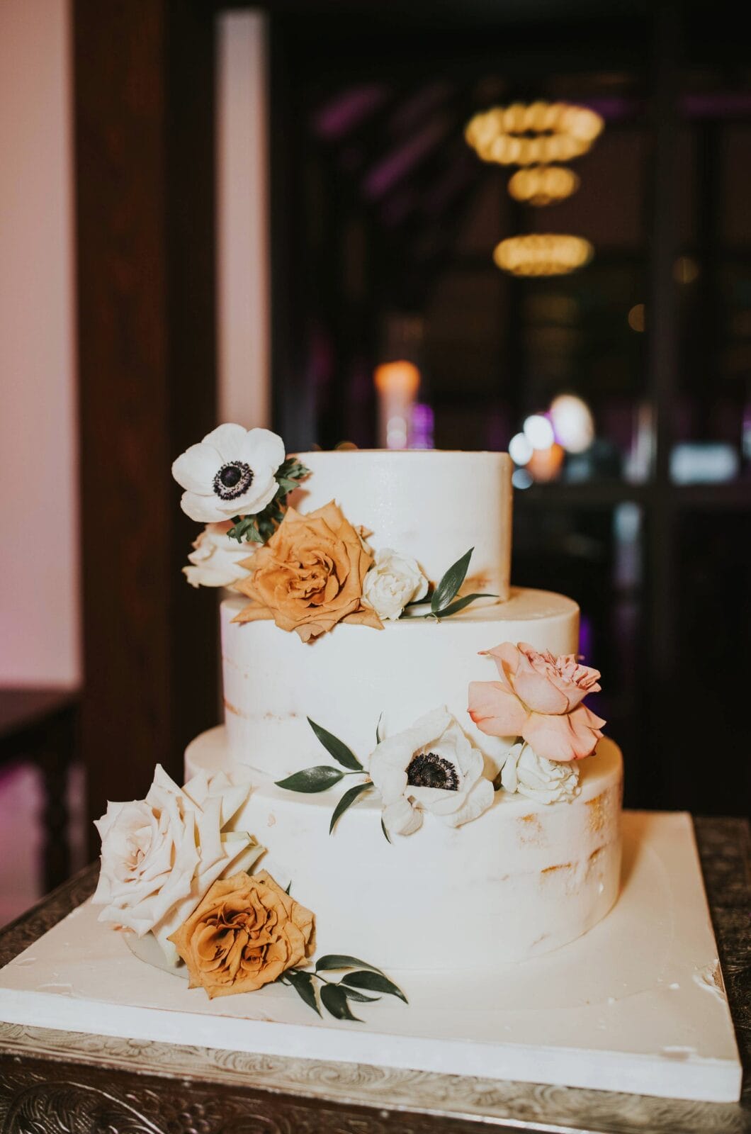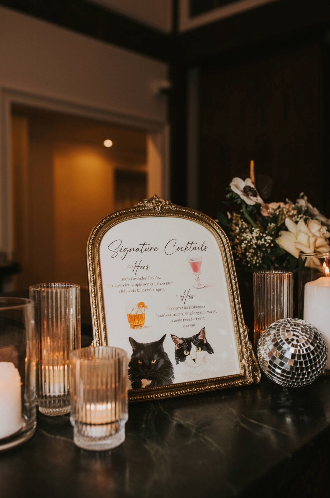 For the evening event, black flowers were added to the floral arrangements, along with candles everywhere, to create a moody, romantic feel.