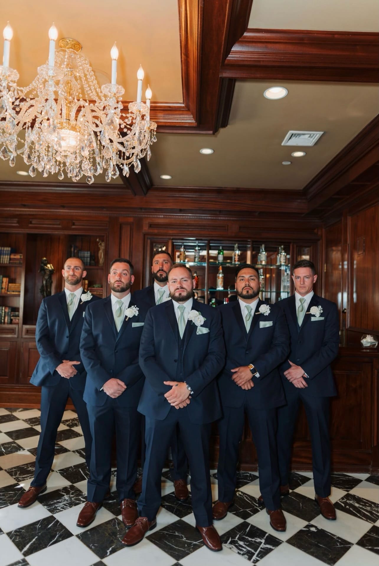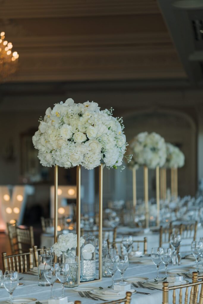 Florals were all white—hydrangeas, orchids, roses and more—complemented by sage greenery. Accent colors were gold and navy blue.