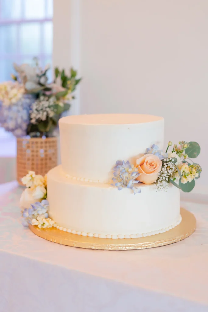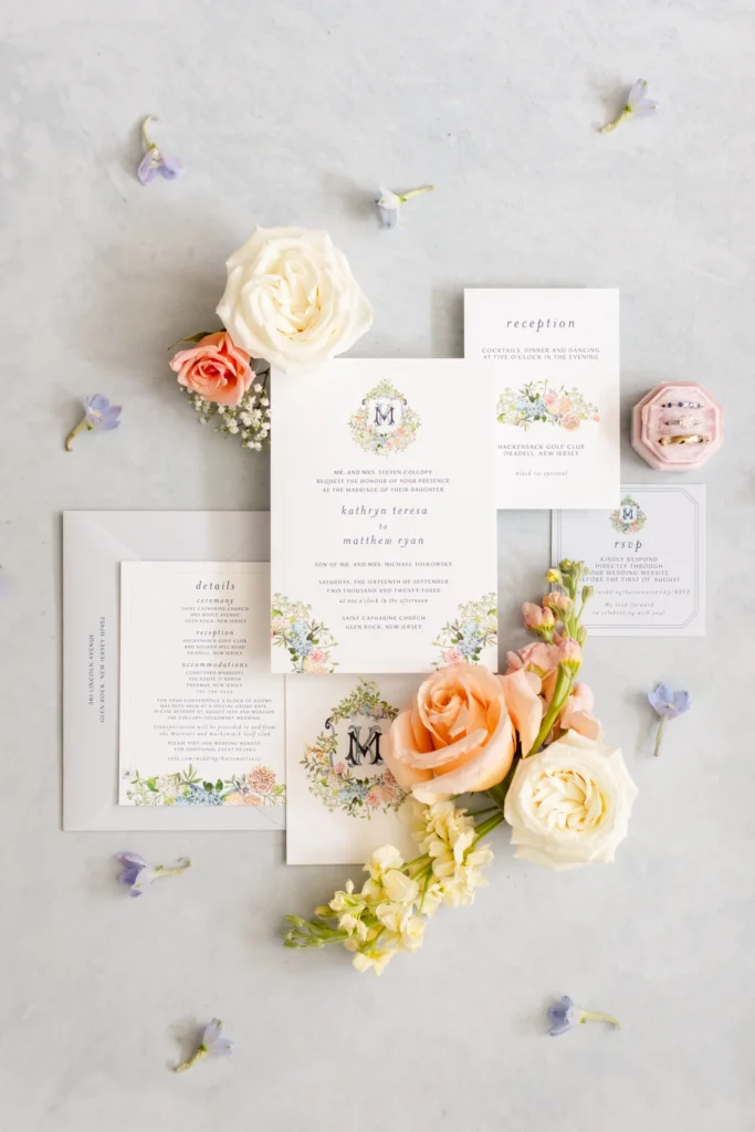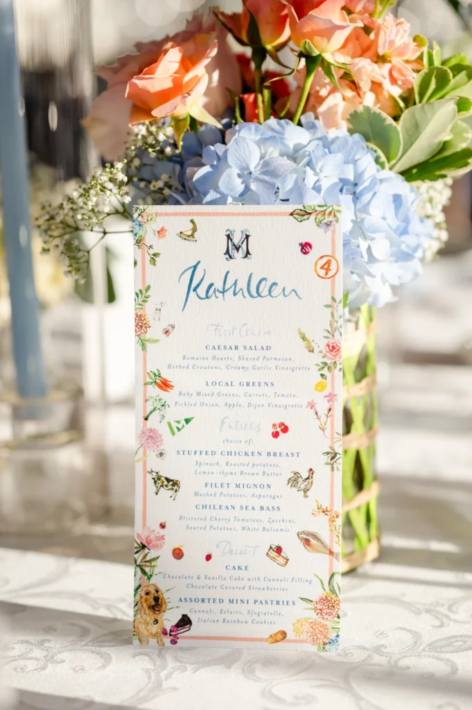 For their September 16, 2023 wedding, the couple was inspired by southern vibes, lots of florals, bamboo, colors, and a “simple yet elegant” vibe, as Katie’s dad kept saying. “I love interior design, southern garden party-type themes, lots of hydrangeas, and a mix of all different types of flowers,” says Katie. “We basically wanted everyone to feel like they were at our home for a big beautiful celebration! We wanted the tables to feel like they were at our dining room table and wanted everything to feel personalized. We had art of our dog throughout, as well as the beach club Matt grew up going to at the Shore, where we now spend our summers. My parents live in Pinehurst, North Carolina, so we had the Putter Boy logo [from Pinehurst Golf Course] as well as our favorite golf course woven throughout the evening in the art on the menus, the escort cards and the signature cocktails. We met on a golf trip, and my parents live in a golf town, so it is a huge part of our lives and what we love to do together. Everything had a personal touch of things that meant the world to us. The wedding came to life exactly as I imagined and hoped for, and it was truly the best day!”