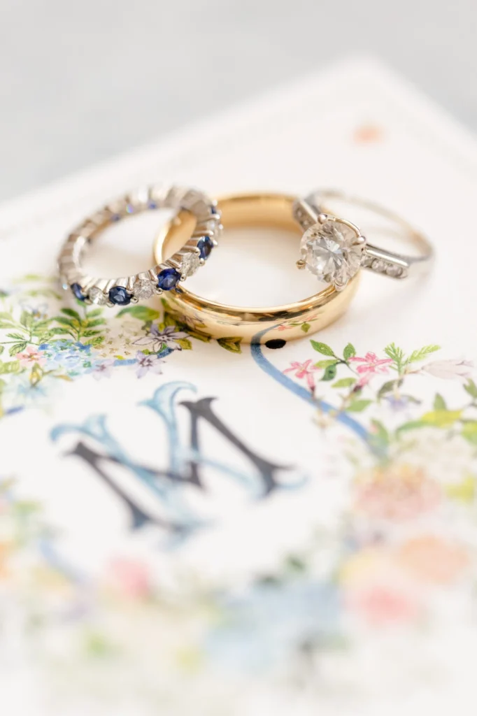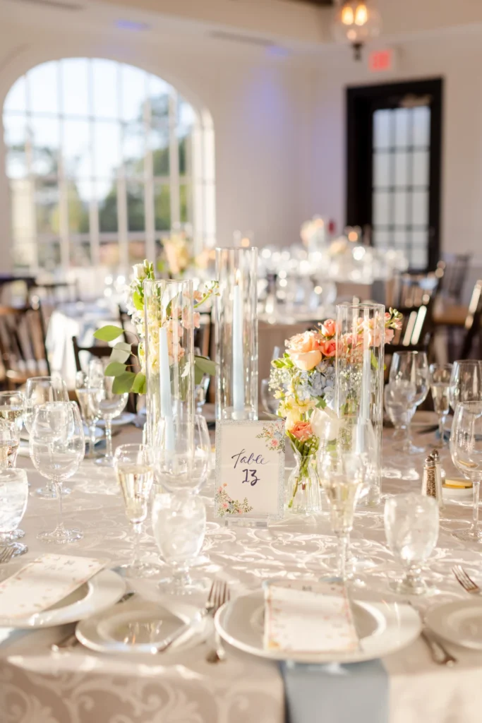 The couple’s menus were a special details that Katie loved. “The colors brought to life everything we imagined and allowed the beautiful centerpieces to shine,” says Katie. “The menus had a lot of personal touches, as well as each guest’s name on the top, so hopefully, when everyone sat down, they felt extra love! It added up to be such a beautiful day of thoughtful detail woven throughout. I love how everything is tied together. My love for interiors, along with my family’s help getting vases from every Michael’s in the tri-state area, to meeting with the florist and the folks at Hackensack Golf Club to seeing the tablescapes come to life, made every single detail so special! Everyone had such a special role in the day and allowed it to come together so smoothly.”