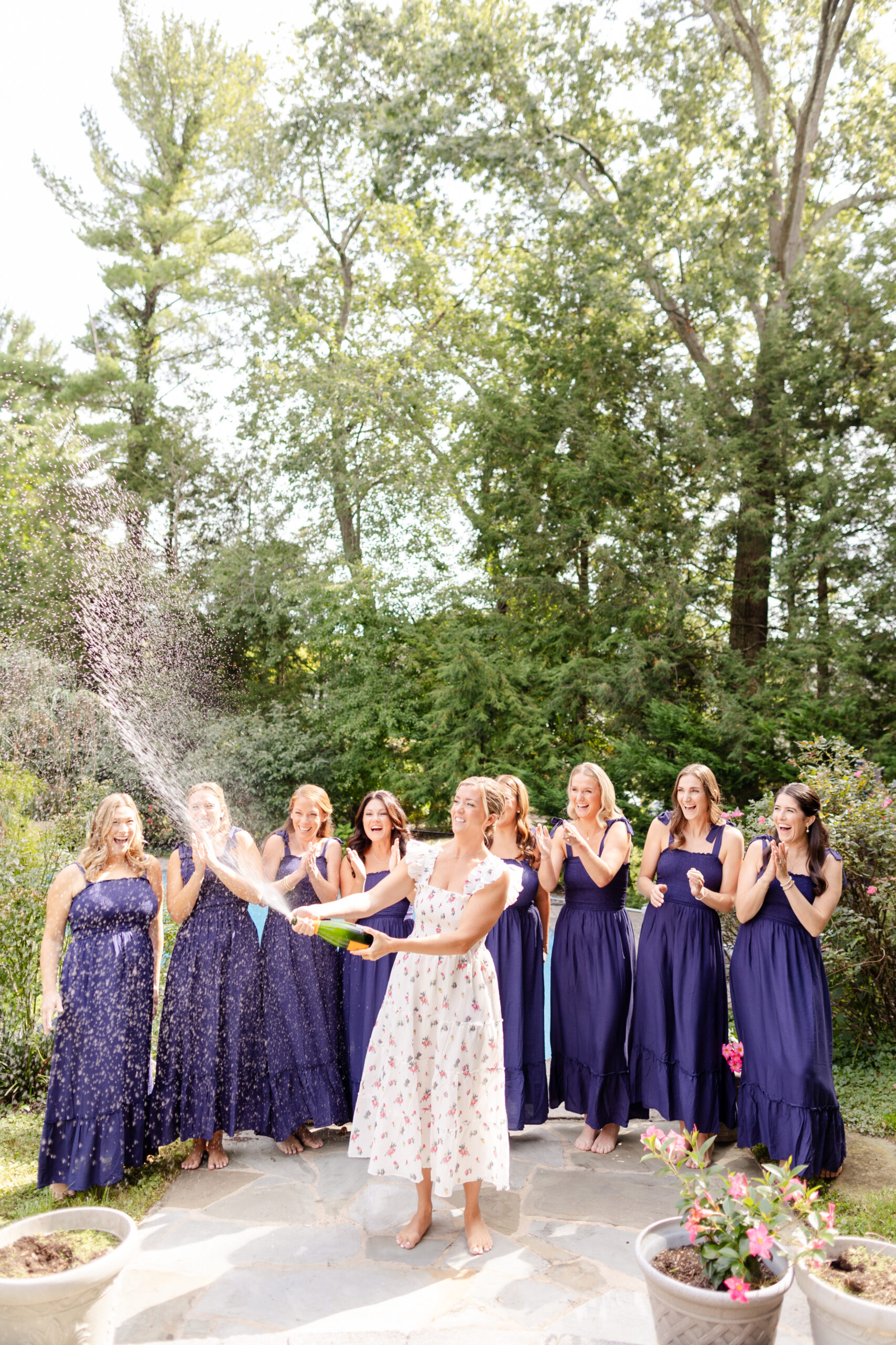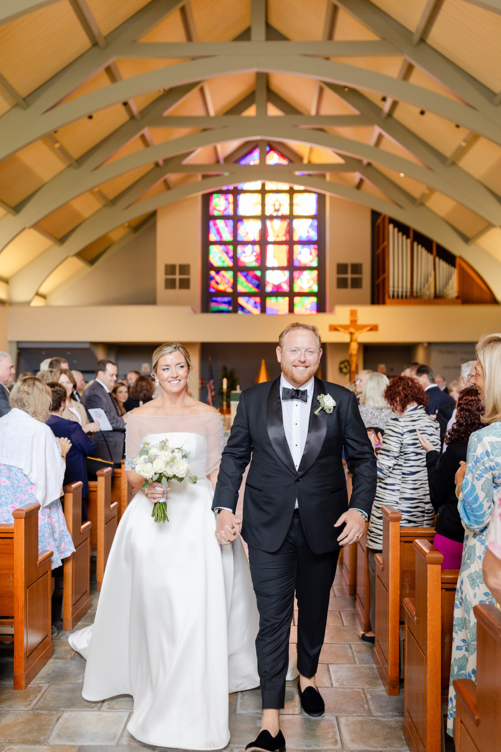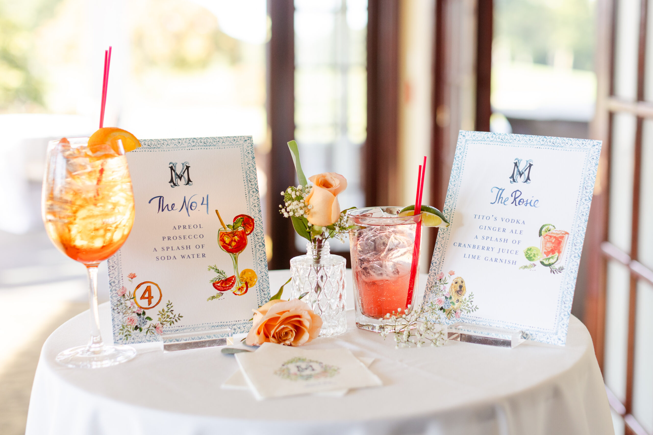 For their September 16, 2023 wedding, the couple was inspired by southern vibes, lots of florals, bamboo, colors, and a “simple yet elegant” vibe, as Katie’s dad kept saying. “I love interior design, southern garden party-type themes, lots of hydrangeas, and a mix of all different types of flowers,” says Katie. “We basically wanted everyone to feel like they were at our home for a big beautiful celebration! We wanted the tables to feel like they were at our dining room table and wanted everything to feel personalized. We had art of our dog throughout, as well as the beach club Matt grew up going to at the Shore, where we now spend our summers. My parents live in Pinehurst, North Carolina, so we had the Putter Boy logo [from Pinehurst Golf Course] as well as our favorite golf course woven throughout the evening in the art on the menus, the escort cards and the signature cocktails. We met on a golf trip, and my parents live in a golf town, so it is a huge part of our lives and what we love to do together. Everything had a personal touch of things that meant the world to us. The wedding came to life exactly as I imagined and hoped for, and it was truly the best day!”