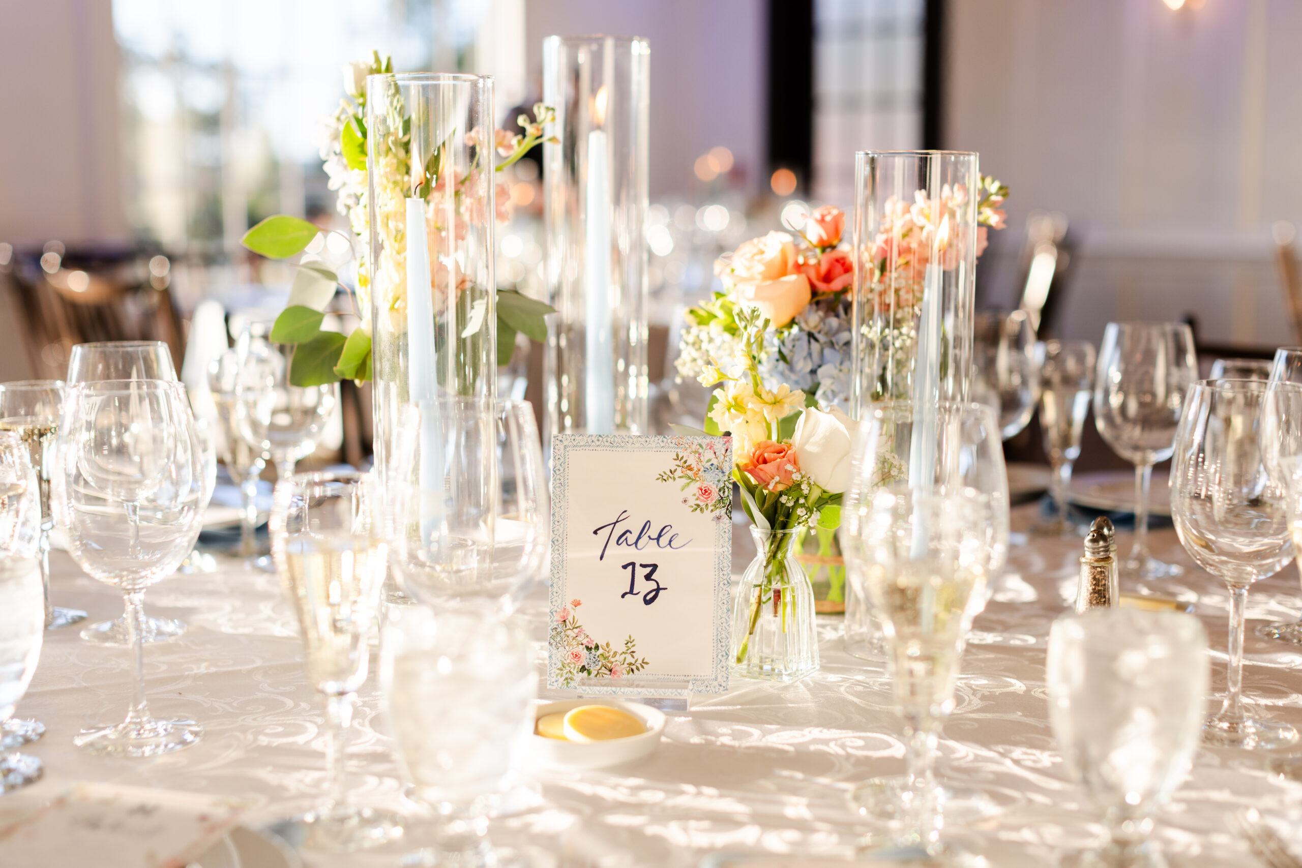 The couple’s menus were a special details that Katie loved. “The colors brought to life everything we imagined and allowed the beautiful centerpieces to shine,” says Katie. “The menus had a lot of personal touches, as well as each guest’s name on the top, so hopefully, when everyone sat down, they felt extra love! It added up to be such a beautiful day of thoughtful detail woven throughout. I love how everything is tied together. My love for interiors, along with my family’s help getting vases from every Michael’s in the tri-state area, to meeting with the florist and the folks at Hackensack Golf Club to seeing the tablescapes come to life, made every single detail so special! Everyone had such a special role in the day and allowed it to come together so smoothly.”