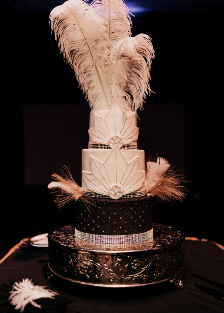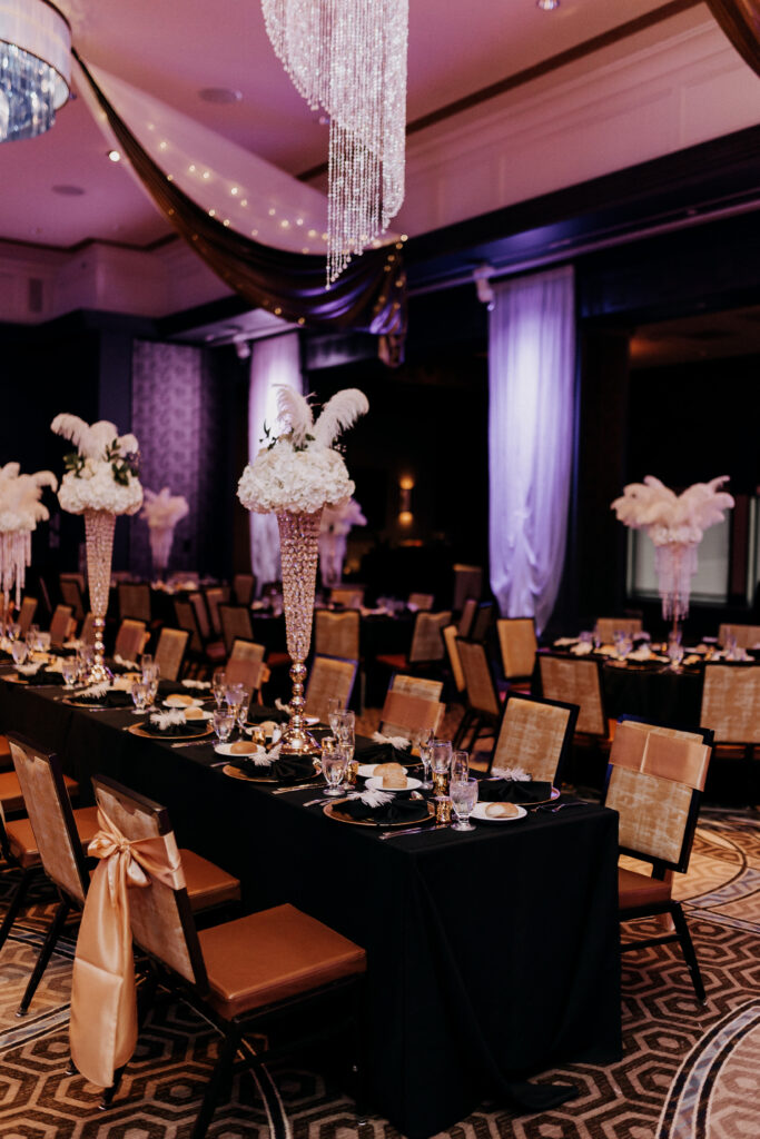 “We pictured gold tones, feathers, fringe, flapper dresses, pearls, champagne towers, jazz music and plenty of dancing,” says Taylor.