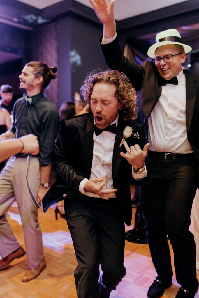 Keeping with the theme, Taylor’s Cinderella Divine gown featured feather sleeves and sewn-in pearls. For the groomsmen, it was custom velvet jackets, bow ties and feather boutonnieres. Guests also got in on the fun. “Our guests truly blew us away with their Gatsbyesque attire,” says Taylor.