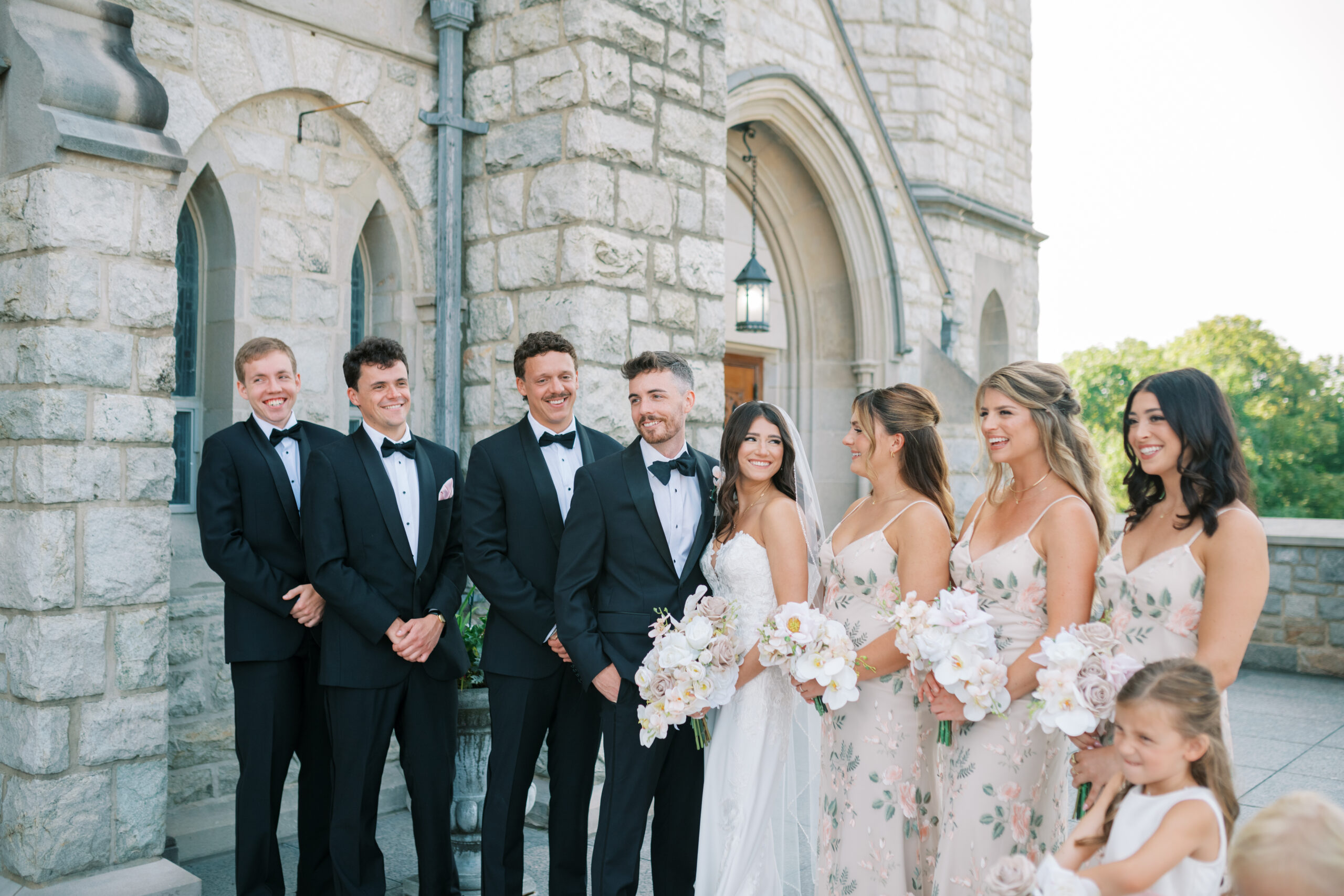 “Our color scheme was white, cream, blush pink and sage,” says Gianna. “Our flowers (rented from Something Borrowed Blooms) matched the bridesmaid dresses.”