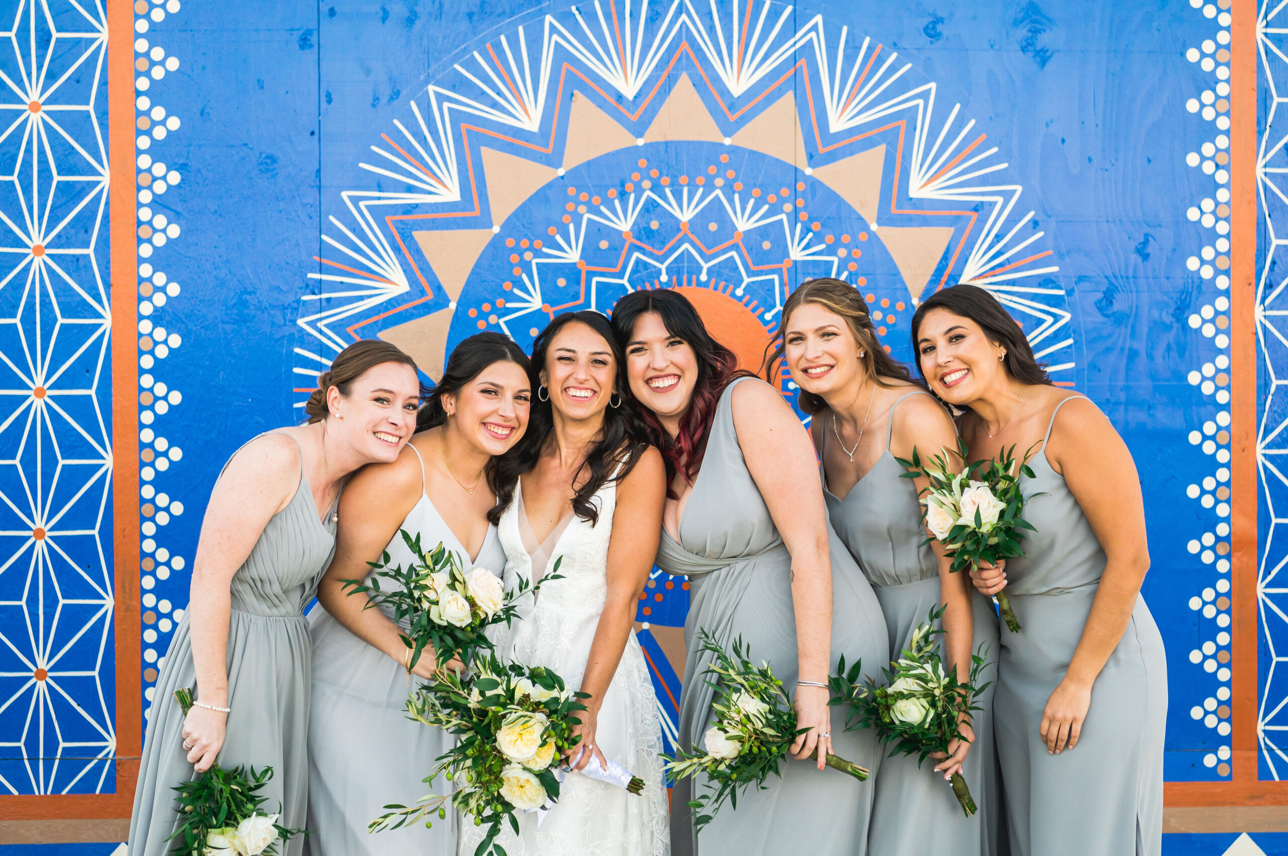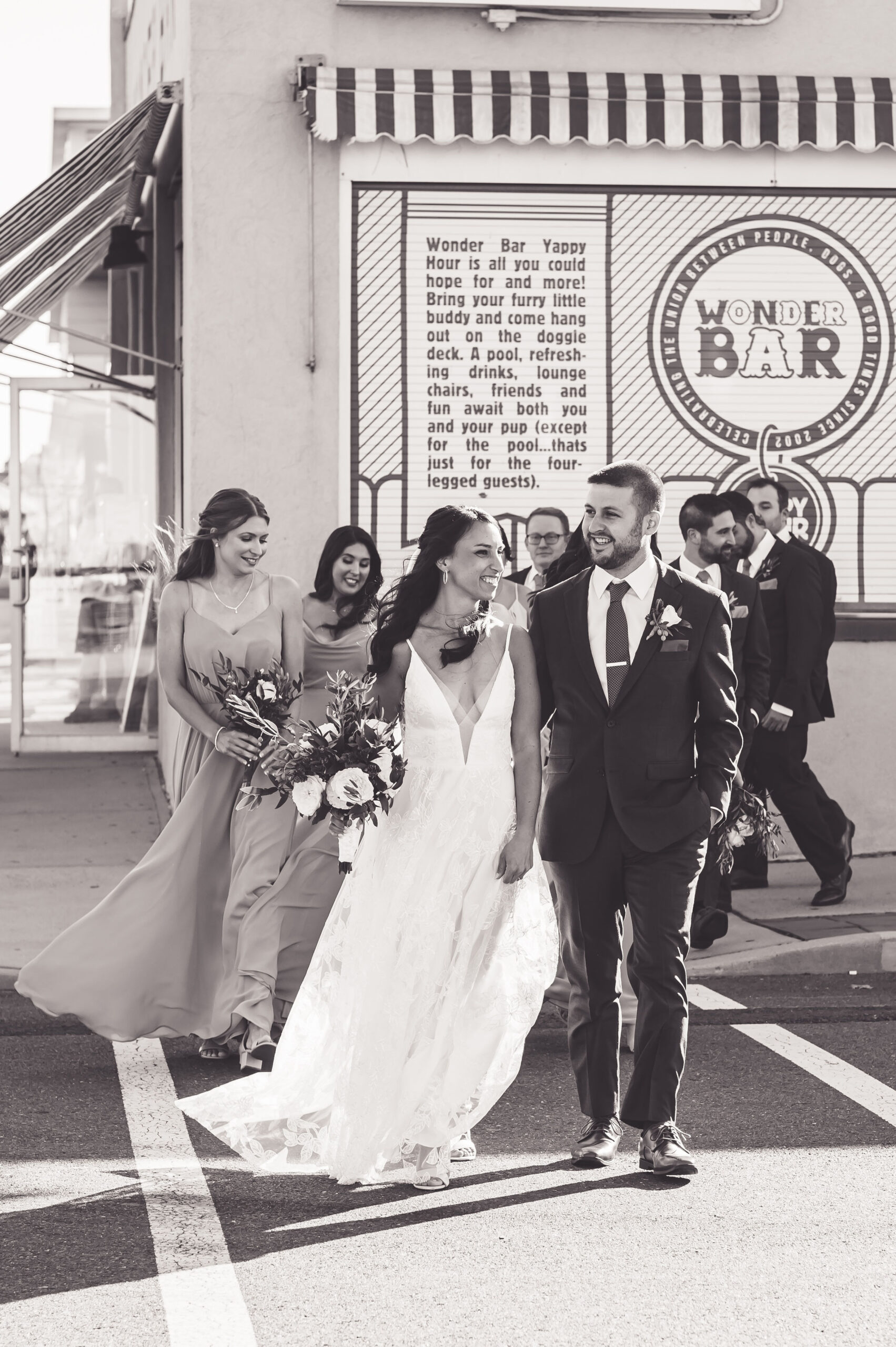 On October 9, 2022, the couple was married at the Asbury Hotel. The bride stunned at the ceremony in a romantic Truvelle A-line gown with lace, sparkles and a cathedral veil. Later, she changed into a long Alyssa Kristin dress for the reception. Maids wore classic dove-gray gowns from Revelry, each in a different style. The groom and his groomsmen were dapper in denim-blue tuxedos.