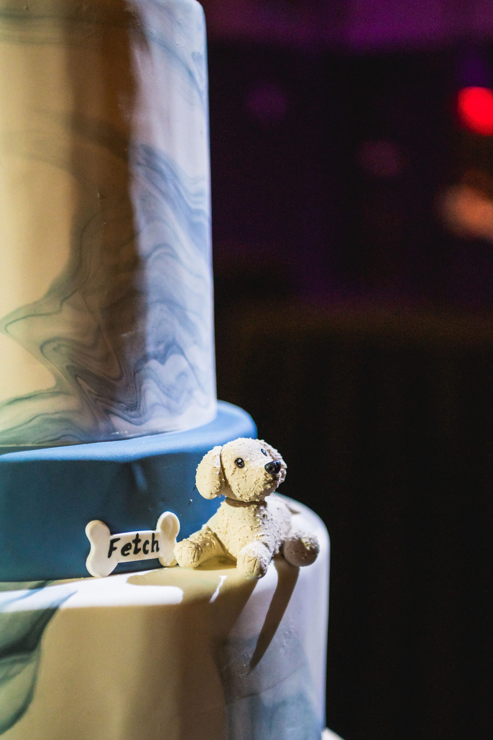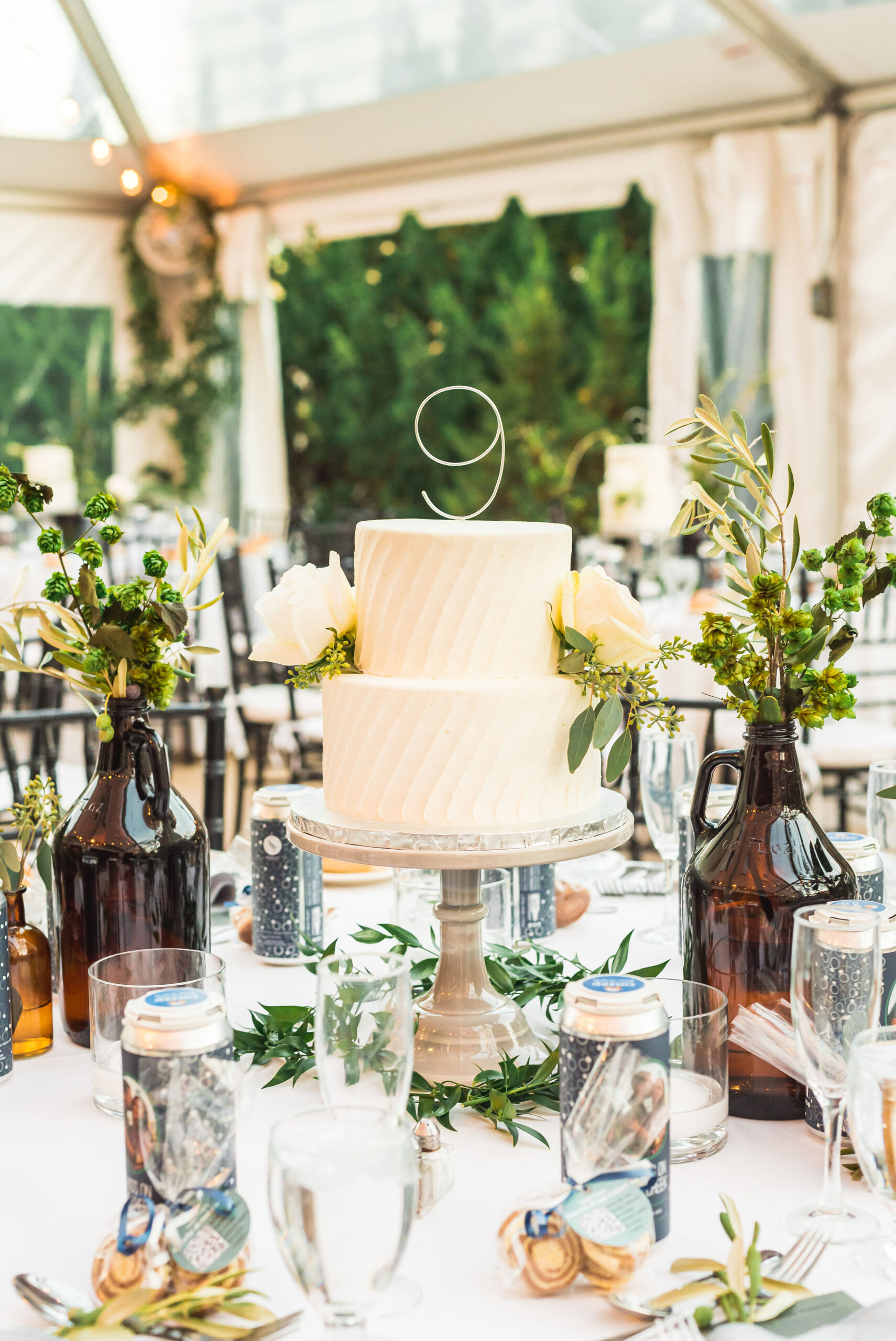 That compromise? Go with the simple theme, but do it 17 times. Rather than decorating the dinner tables with traditional floral centerpieces, the mother-daughter team decided to outfit each one with its own simple, two-tiered cake adorned with fresh blossoms as well as hops, imported from Oregon, as a nod to the groom’s work at Harpoon Brewery in Boston. Cake number 18 was more elaborate, allowing Lisa to show off her unique marbling technique. “We marbled and remarbled various shades of fondant in a show-stopping gray color to create a random pattern, she says.