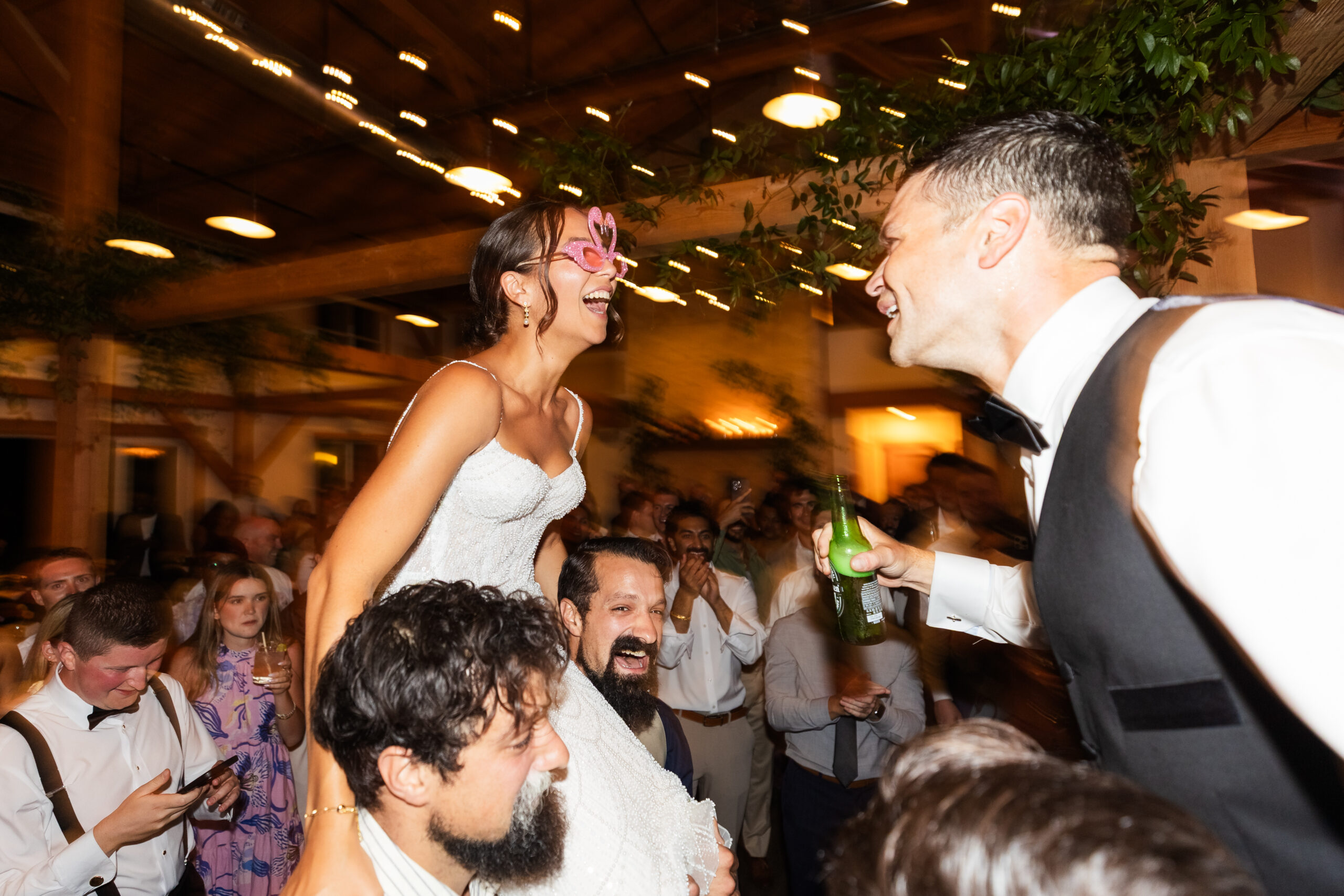 “The day was a culmination of months and months of planning, so each part felt momentous in its own way,” says Alissa. “But there was a moment right before the ceremony when Tarran and I were gathered with the entire wedding party in The Farm’s loft. A few people shared a toast, you could hear our band Epic Soul warming up, and the excitement felt really electric.”