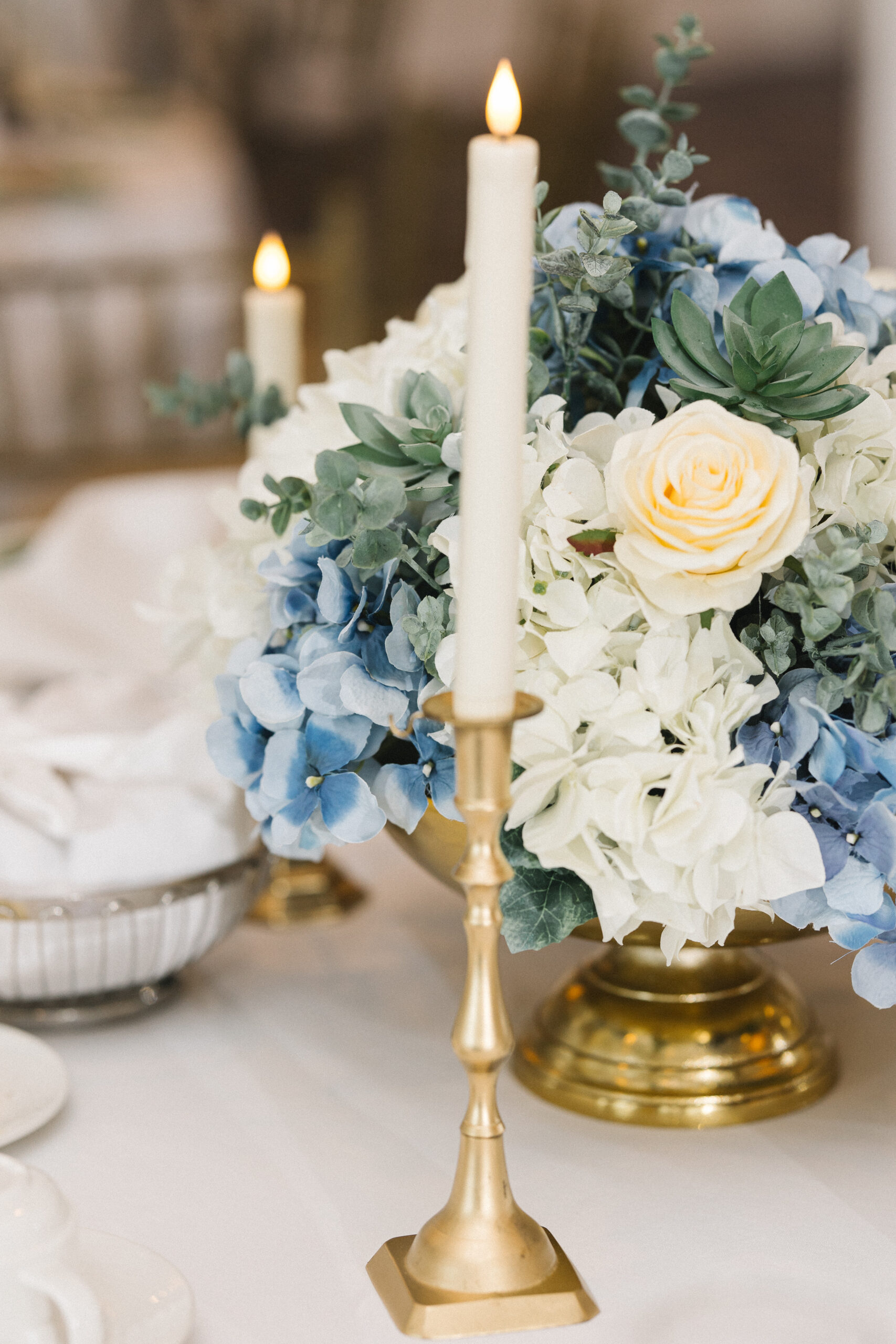“We decided on navy blue and brass for its timeless look, along with light blue and ivory to complement. Planning a wedding from across the country, we were lucky to have a venue that provided centerpieces within our color scheme.”