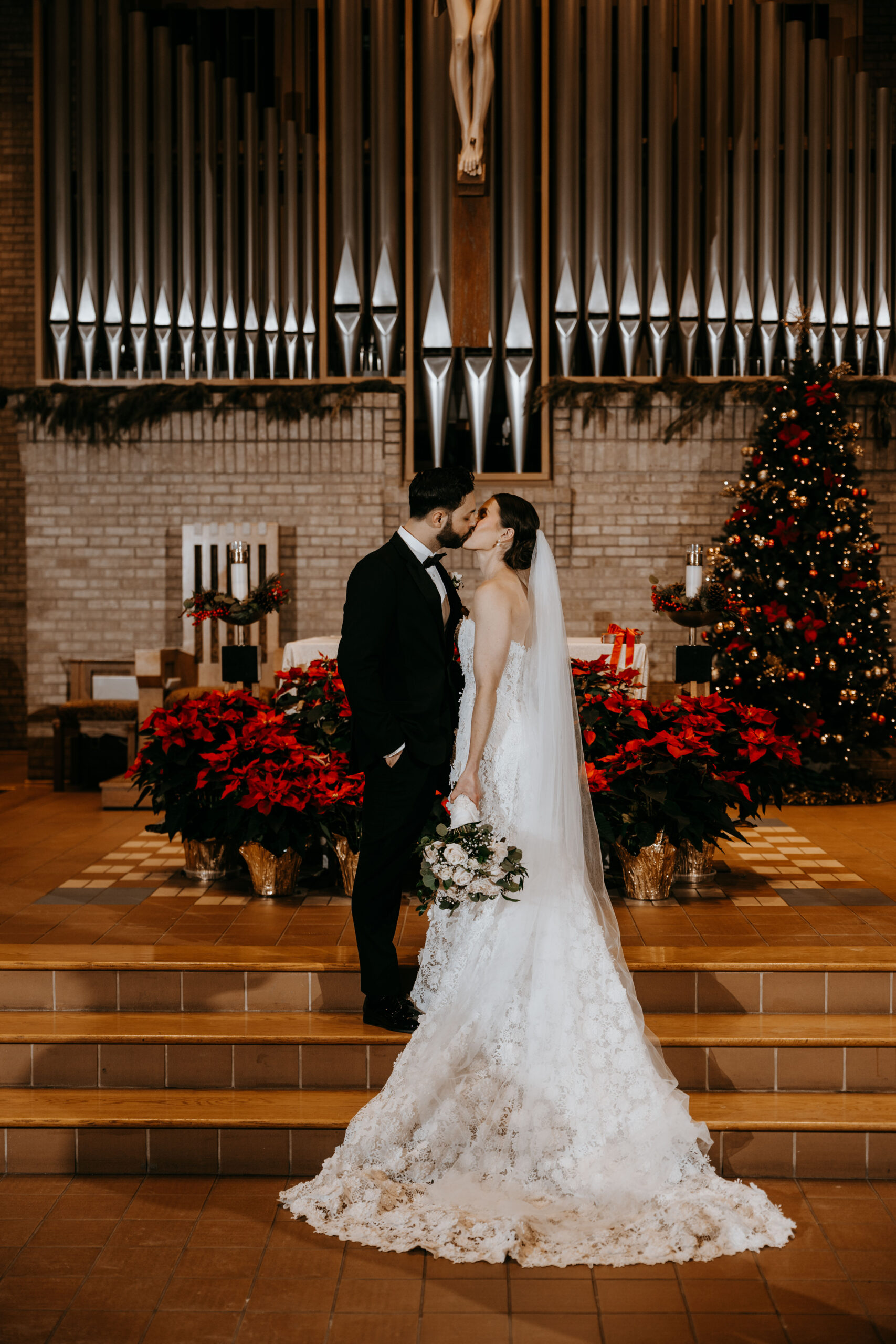 Robert wore a fitted tux from Men’s Wearhouse with a white pocket square. As well as his grandfathers cross necklace that was given to him after his grandfather passed away in 2024 (shortly after their engagement).