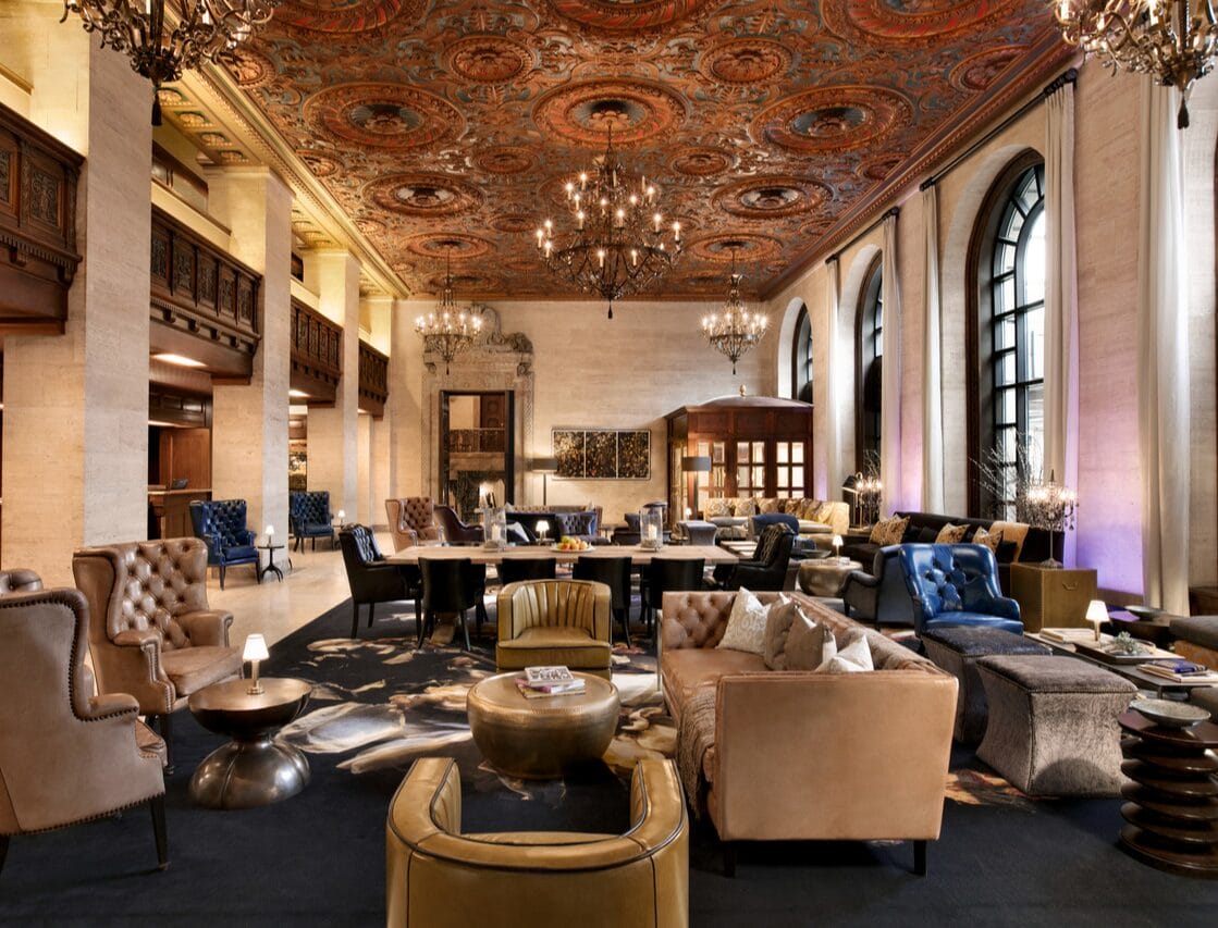 A showcase of architectural flair, the building’s original grandeur can be seen in its gold-accented ceilings, French-influenced reliefs and a showstopping stone staircase with intricate ironwork. The 217 king- and queen-sized quarters are classically appointed and feature marble baths with jetted soaker tubs.