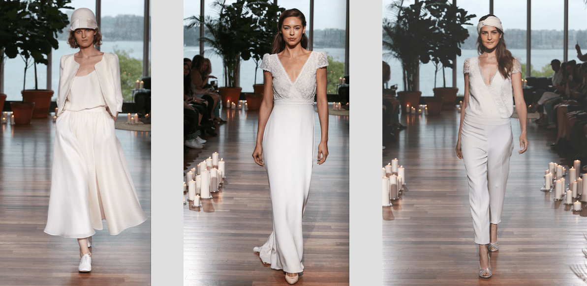 2. Laure de Sagazan. Her hip, ’70s-inspired collection includes drop-waist gowns, pantsuits and separates in soft French Calais lace in fluid silk. This designer infuses West-Bank elegance into her statement separates, boho silhouettes and delicate lace details.