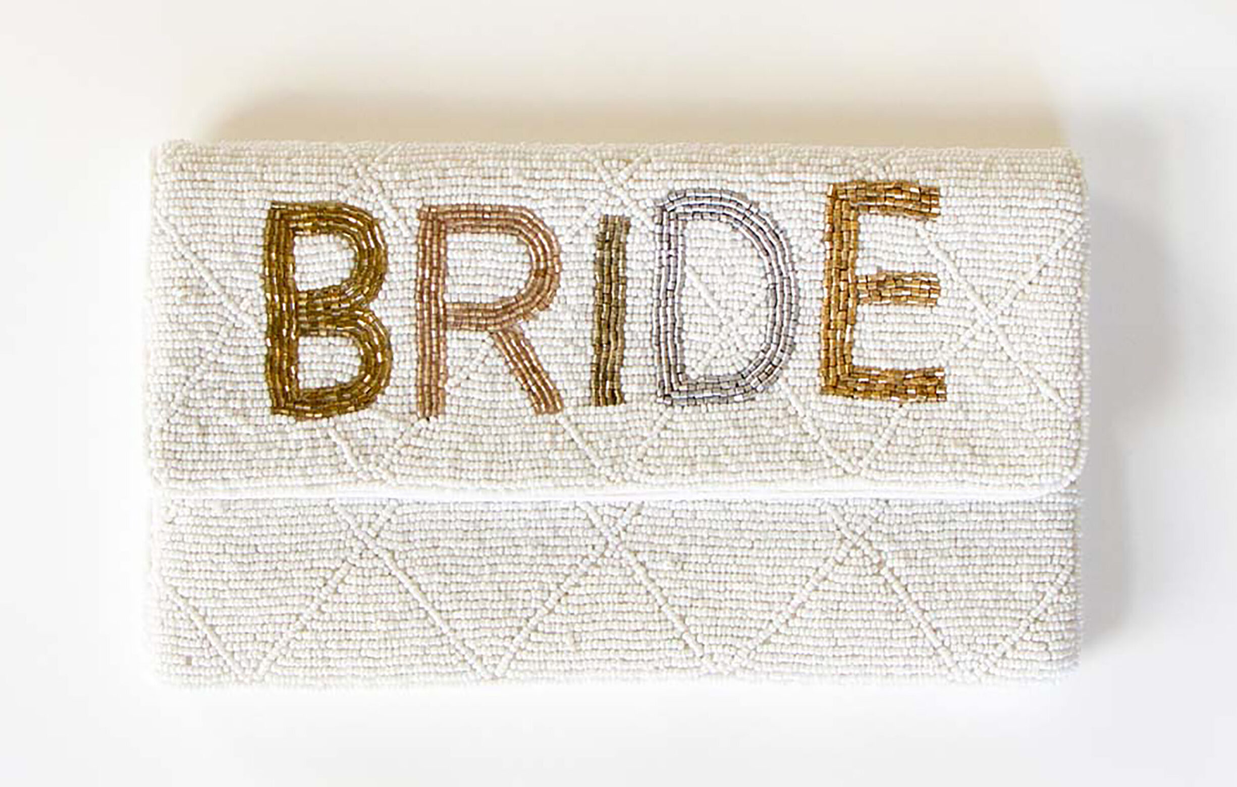 HERE COMES THE BRIDE: Store your essentials in style with the handmade beaded bride clutch bag; $57.49 at prettyrobes.com.