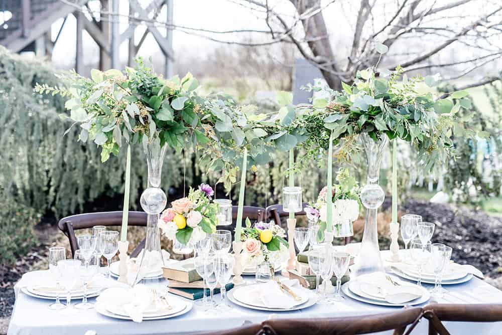 Breakfast At Tiffany’s Couples have been in love with this theme for decades, but here it is with a vintage spin. Rockhill tucked lush luxe blooms into delicate jardin jars set atop stacked vintage books. She then added candlelight from tapers to floating candles to jar candles, resulting in a glowing tablescape. The muted blush and purple hues pop against the Tiffany-blue linen, and the layered place setting with knotted blush napkins and menus complete this look oh so perfectly.